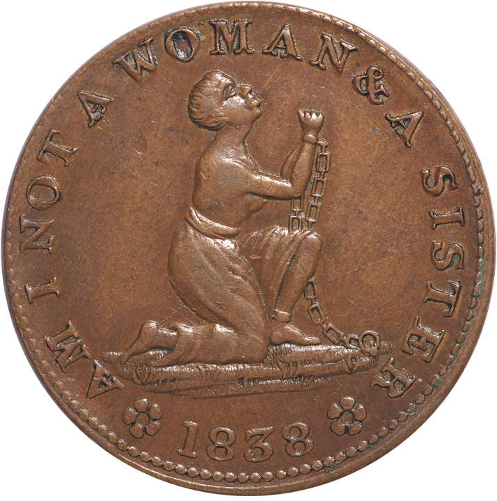 1838-Dated. Anti-Slavery Hard Times Token. “Am I Not A Woman And A Sister.” Rulau 81 (Low 54). NGC graded About Uncirculated-58 Brown.