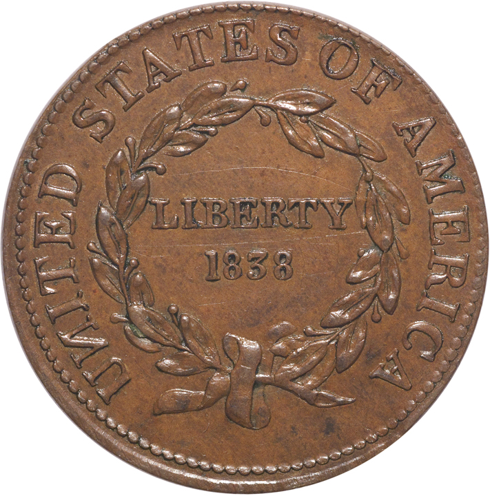 28mm. This flashy, beautifully presented Anti-Slavery token is styled after Josiah Wedgewood’s very popular “Am I Not a Man and a Brother” plaque, a design which also appeared on some British tokens issued around 1795. Issued in America, this token sought to bring attention to the plight of slaves, particularly the black women who were being held in bondage in many of the States. The obverse features a Black woman on one knee, her arms shackled, pleading for humanity. The reverse has “Liberty 1838” within a wreath, with the words “United States Of America” surrounding. This token is a perfect, natural brown in color with smooth hard surfaces and highly attractive. Rarely seen in this quality, virtually Uncirculated, having only some light friction on its highest points.