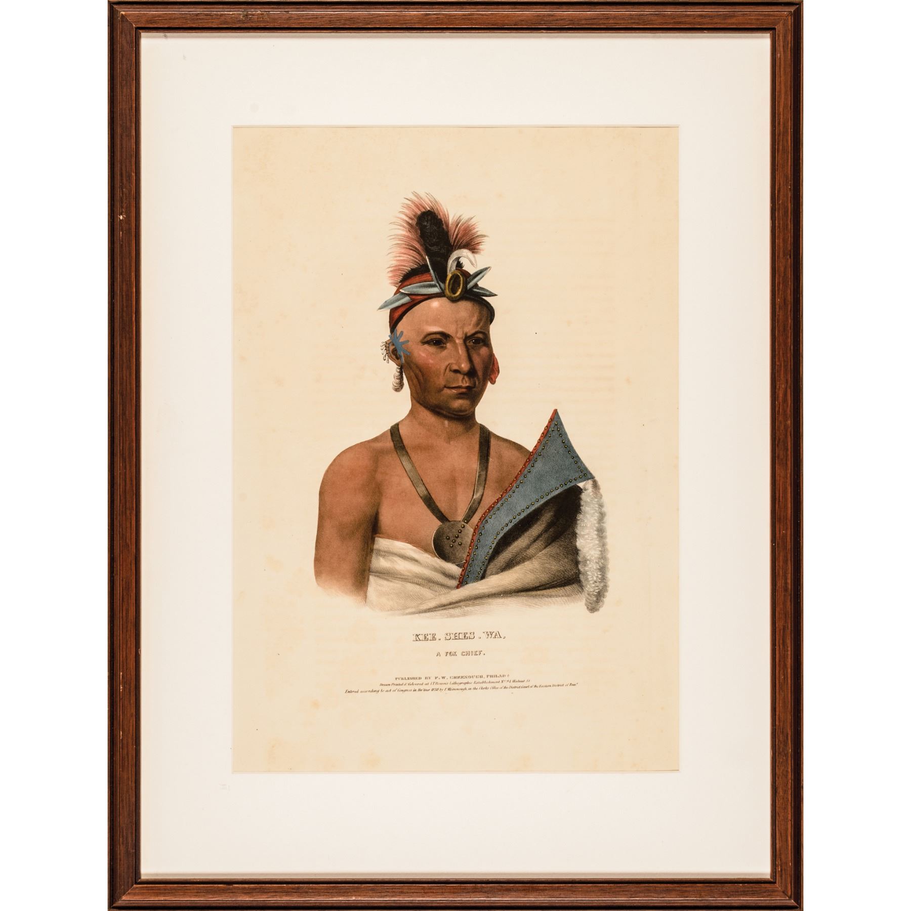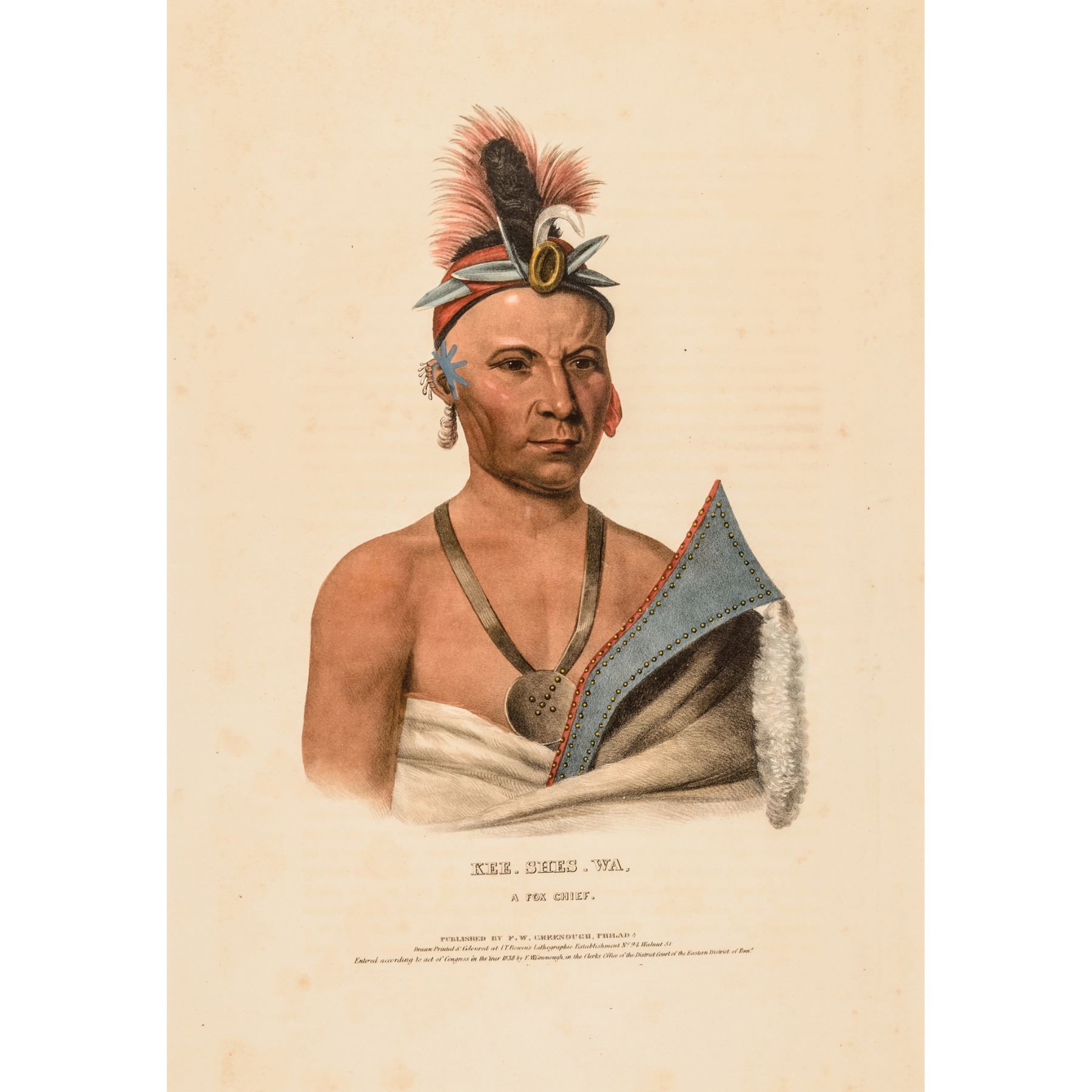 1838-Dated, Hand-Colored Thomas McKinney (1785-1859) and James Hall (1793-1868), Lithograph Print: “Kee-Shes-Waa, A Fox Chief,” shown wearing his large Silver Breastplate Decoration, published by “F.W. Greenough, Philad,” Choice Extremely Fine.