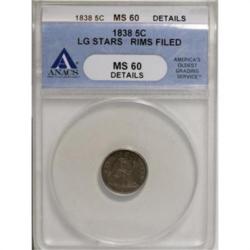 <B>1838 H10C Large Stars, No Drapery--Rim Filed--ANACS MS60 Details.</B></I> NGC Census: (1/465). PCGS Population (5/305). Mintage: 2,225,000. Numismedia Wsl. Price for NGC/PCGS coin in MS60: $225. (#4317)<BR><I>From The Al Blythe Collection of Half Dimes.</B></I><BR><BR><B>Coin Engraver:</B> Christian Gobrecht<BR><BR><b>Shipping:</b> Coins & Currency (<a target="_blank" href="http://www.heritageauctions.com/common/shipping.php">view shipping information</a>)
