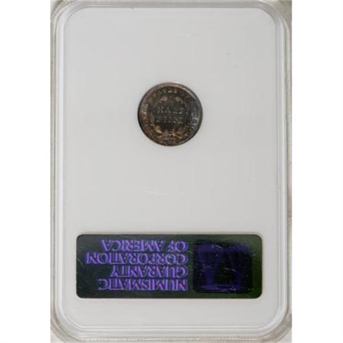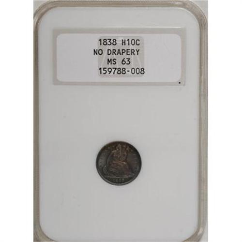 <B>1838 H10C Small Stars MS63 NGC.</B></I> Described by NGC as a No Drapery piece, with no mention of the Small Stars feature. This is a late die state with heavy clash marks in the fields, and severe die rust on the devices. Heavy clash marks at Liberty's elbow give the appearance of partial drapery, similar to the dime variety of this date. The surfaces are fully lustrous with exceptional blue, lilac, and rose toning over pale gold surfaces.<BR><I>From The Al Blythe Collection of Half Dimes.</B></I><BR><BR><B>Coin Engraver:</B> Christian Gobrecht<BR><BR><b>Shipping:</b> Coins & Currency (<a target="_blank" href="http://www.heritageauctions.com/common/shipping.php">view shipping information</a>)