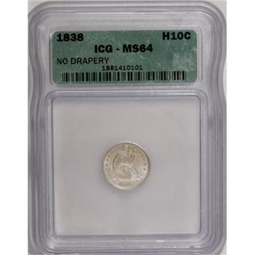 <B>1838 H10C Large Stars, No Drapery MS64 ICG.</B></I> Sharply detailed and highly lustrous with brilliant satin surfaces and a trace of pale champagne toning on the reverse.<BR><I>From The Al Blythe Collection of Half Dimes.</B></I><BR><BR><B>Coin Engraver:</B> Christian Gobrecht<BR><BR><b>Shipping:</b> Coins & Currency (<a target="_blank" href="http://www.heritageauctions.com/common/shipping.php">view shipping information</a>)
