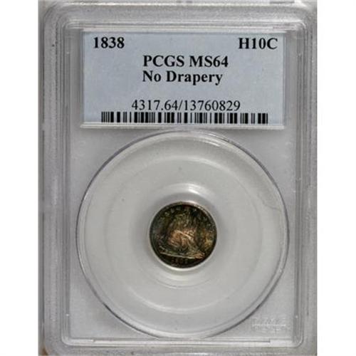 <B>1838 H10C Large Stars, No Drapery MS64 PCGS.</B></I> The obverse of this early Seated half dime exhibits right blue-green and golden-tan patina, while the reverse shows only wisps of caramel peripheral toning around a strongly lustrous silver-gray center. Well-defined with grand eye appeal.<BR><BR><B>Coin Engraver:</B> Christian Gobrecht<BR><BR><b>Shipping:</b> Coins & Currency (<a target="_blank" href="http://www.heritageauctions.com/common/shipping.php">view shipping information</a>)