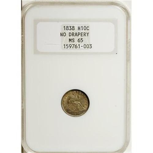 <B>1838 H10C Large Stars, No Drapery MS65 NGC.</B></I> An exquisitely struck Gem example of this No Drapery issue. The lustrous surfaces shine beneath rich olive-gold, blue, and rose patina. An incredibly appealing and desirable selection for the type or date collector.<B><BR></B></I><I>From The Beau Clerc Collection.</B></I><BR><BR><B>Coin Engraver:</B> Christian Gobrecht<BR><BR><b>Shipping:</b> Coins & Currency (<a target="_blank" href="http://www.heritageauctions.com/common/shipping.php">view shipping information</a>)