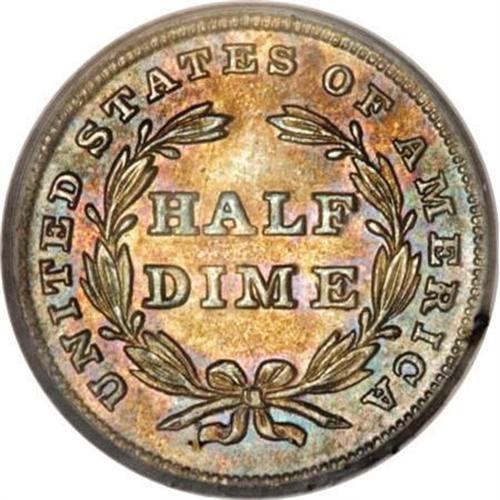 <B>1838 H10C Large Stars, No Drapery MS65 PCGS.</B></I> A blend of golden-orange, lilac, and sky-blue toning bathes the lustrous surfaces of this lovely Gem half dime, and an attentive strike leaves excellent definition on the design features. Well preserved surfaces reveal no marks worthy of individual mention. Population: 45 in 65, 23 finer (12/07).<BR><BR><B>Coin Engraver:</B> Christian Gobrecht<BR><BR><b>Shipping:</b> Coins & Currency (<a target="_blank" href="http://www.heritageauctions.com/common/shipping.php">view shipping information</a>)