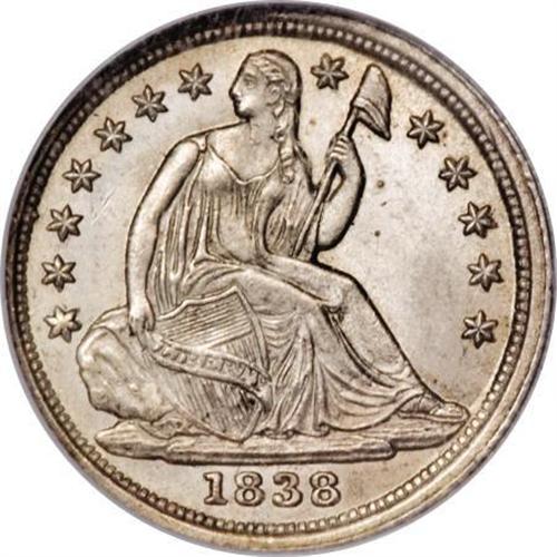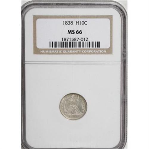 <B>1838 H10C Large Stars, No Drapery MS66 NGC.</B></I> On the obverse, star 1 is flat, and on the reverse, the next to top group of leaves in the left branch are flat. However, all other design elements on both sides are boldly defined. This Premium Gem exhibits faint champagne toning over ivory surfaces. Both sides have brilliant mint frost. Census: 46 in 66, 24 finer (1/08).<BR><I>From The Southwest Collection.</B></I><BR><BR><B>Coin Engraver:</B> Christian Gobrecht<BR><BR><b>Shipping:</b> Coins & Currency (<a target="_blank" href="http://www.heritageauctions.com/common/shipping.php">view shipping information</a>)