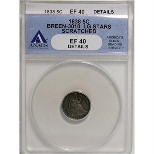 <B>1838 H10C Large Stars, No Drapery--Scratched--ANACS XF40 Details.</B></I> Breen-3010. NGC Census: (2/552). PCGS Population (4/420). Mintage: 2,225,000. Numismedia Wsl. Price for NGC/PCGS coin in XF40: $58. (#4317)<BR><I>From The Al Blythe Collection of Half Dimes.</B></I><BR><BR><B>Coin Engraver:</B> Christian Gobrecht<BR><BR><b>Shipping:</b> Coins & Currency (<a target="_blank" href="http://www.heritageauctions.com/common/shipping.php">view shipping information</a>)