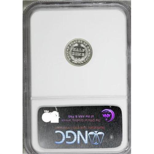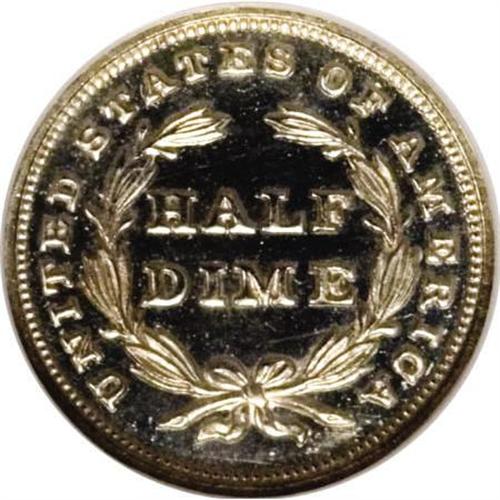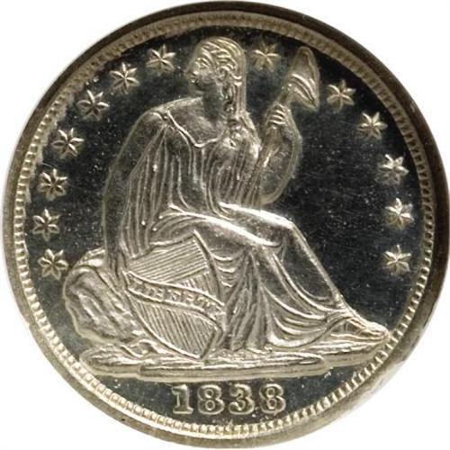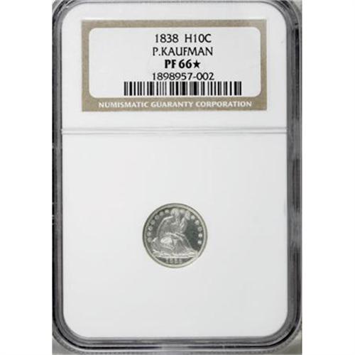 <B>1838 H10C No Drapery PR66 <img src="/images/star.gif" width="10" height="10" alt="" border="0"> NGC.</B></I> Ex: P. Kaufman. The 1838 half dime is extremely rare in proof format. The Kaufman specimen, earlier from the famous Eliasberg Collection, is easily the finest known proof 1838 half dime. It is our belief that just two or three proofs are known. Walter Breen, in his 1988 <I>Complete Encyclopedia of U.S. and Colonial Coins</B></I>, says "About 5 proofs" were minted. Similarly, Al Blythe, in <I>The Complete Guide to Liberty Seated Half Dimes</B></I>, gives the proof mintage as "5 to 6." The present certified population falls well short of these production estimates. Just two examples have been certified, a PR63 and the present PR66 <B><img src="/images/star.gif" width="10" height="10" alt="" border="0"></B></I>, both NGC graded. <BR><BR>Expectedly, there have been few public auction appearances of the 1838 proof half dimes over many years. Our pedigree roster is based on a review of those auction appearances known to us: <BR><BR><B>1. PR66 <img src="/images/star.gif" width="10" height="10" alt="" border="0"> <img src="/images/star.gif" width="10" height="10" alt="" border="0">NGC. The Philip Kaufman specimen. </B></I>Matthew A. Stickney (Henry Chapman, 6/1907); John M. Clapp; Clapp Estate (1942); Louis E. Eliasberg, Sr.; Eliasberg Estate (Bowers and Merena, 5/1996), lot 943; Philip Kaufman.<BR><B><BR>2. PR65. </B></I>David Bullowa (5/1952), lot 1032; John Jay Pittman (David Akers, 10/1997), lot 455.<BR><BR><B><I>Additional Appearances</B></I></B></I><BR><B>A. Proof.</B></I> Adolph Friedman, 1946 American Numismatic Association (Numismatic Gallery, 8/1946), lot 52, $11. "With stars. No Drapery. Gem steel-blue proof. Rare." Not plated. This is possibly the Pittman Collection coin, number 2 in our roster above.<BR><BR><B>B. PR63 NGC. </B></I> Appears on the NGC Census Report, and possibly the same as the Pittman coin, but more likely a third known proof, probably one of the other two appearances listed here.<BR><B><BR>C. Proof.</B></I> Abner Kreisberg and Hans M.F. Schulman (2/1960), lot 1110. This coin is described in the catalog as "Gem Proof, very rare" with no further details or photo.<BR><BR>The Eliasberg-Kaufman coin is attributed as Valentine-6, and the Pittman coin is identified as Valentine-10, with a prominent break between the wreath and AMERICA. The obverse of V-6 has several extra points showing in star 3, a misshapen star 8 with the lowest right ray defective at the tip and larger than the others, and the reverse has the right bases of the first T in STATES and the first A in AMERICA double punched, and notching on the tip of the innermost leaf under the D of DIME. A narrow crescent of coarse vertical die lines is evident along the rim between 9 and 12 o'clock on the obverse. Magnification brings out die polish lines in the fields, which are heavier on the reverse.<BR><BR>Deeply mirrored fields and fully lustrous motifs create obvious cameo contrast, and a powerful strike manifests itself in sharp delineation on the design features. The star radials are bold, with the sole exception of minor softness in those of star 11, and there is complete separation of Liberty's foot, sandal, and associated straps. Liberty's hair is also crisp, as is the ribbing in the leaves of the reverse wreath; only the leaf cluster beneath the first S of STATES reveals slight weakness. Impeccable preservation characterizes the surfaces on both sides, such that is nearly impossible to locate markers for pedigree purposes. With this combination of attributes, it is no wonder that NGC saw fit to assign the coveted Star designation to this splendid Premium Gem proof half dime.<BR><I>From The Phil Kaufman Collection of Early Seated Proof Sets, Part Two.</B></I><BR><BR><B>Coin Engraver:</B> Christian Gobrecht<BR><BR><b>Shipping:</b> Coins & Currency (<a target="_blank" href="http://www.heritageauctions.com/common/shipping.php">view shipping information</a>)