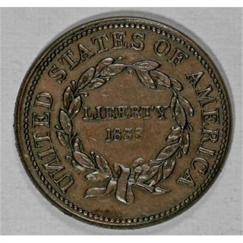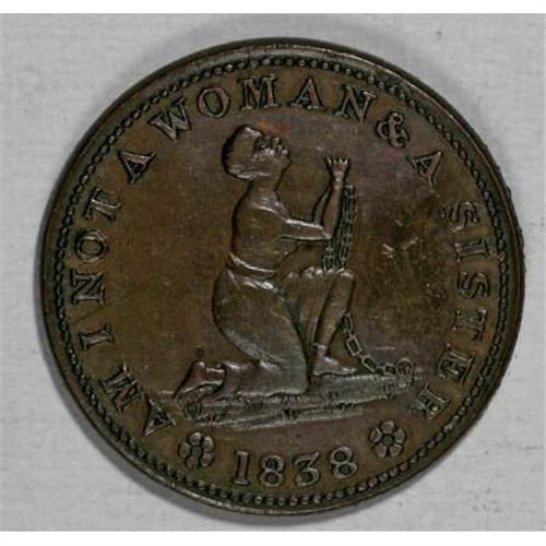 <B>1838 Hard Times "Am I Not A Woman" VF35 Uncertified.</B></I> Low-54, HT-81, R.1. 28 mm. Famous antislavery token. Boldly struck with nearly 180-degree rotation. Well detailed for the grade with deep reddish-brown toning, modest wear, some scattered minor marks. A wispy pinscratch on the obverse extends into field area from the rim near 9 o'clock. <BR><BR><b>Shipping:</b> Coins & Currency (<a target="_blank" href="http://www.heritageauctions.com/common/shipping.php">view shipping information</a>)
