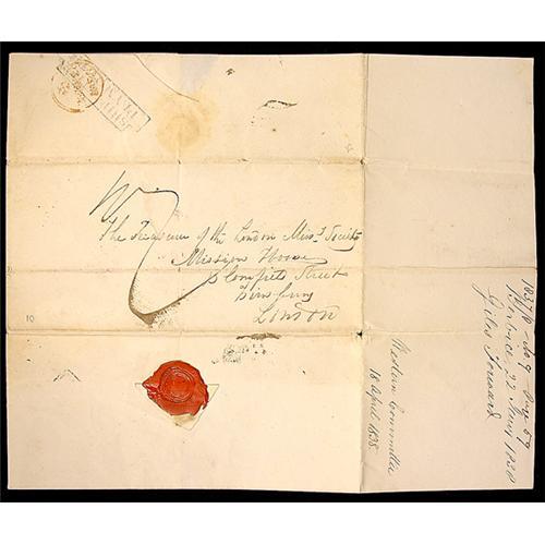 <Our item number 140080><B>1838 Letter From Berlice (Guyana), Boimern, To the London Missionary Society.</B> Autograph letter from Giles Touaard to the Treasurer of the London Missionary Society regarding payment of his salary, 12½ x 8 in., 1838, 22 Jan, 1p. Red seal is intact on address leaf. Slight tear, small piece missing from label with no affect to text. <BR>Estimated Value $300 - 400. <BR><BR>Our item number 140080<BR><IMAGES><P ALIGN="CENTER"><IMG SRC="http://www.goldbergcoins.net/liveauction/49jpegs/140080.jpg"> </P></IMAGES>