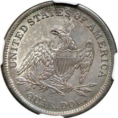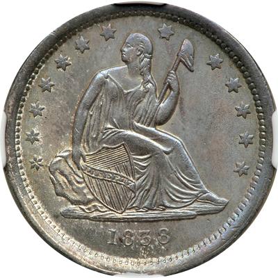 1838 Liberty Seated Quarter Dollar. NGC graded MS-63. Lovely shades of light blue and silver toning. Popular no drapery quarter. This issue is known for average striking detail, the high points of Liberty's features and the star centers often indistinct. So they are on this coin, and we also note that the denticles are a bit soft here and there around both sides. The reverse eagle, however, is bold. Both sides are equally free of spotting and grade-limiting abrasions, while the appearance is natural gray with a sheen to the surface from the supporting luster. The eye appeal is choice. One of the most respected early silver coins and a bidding opportunity for the No Drapery collector that is probably a coin soon to be rarer still. In a new 4 pronged NGC holder. Pop 19; 32 finer.