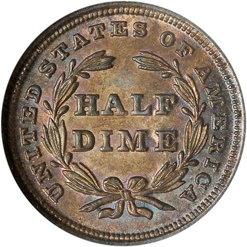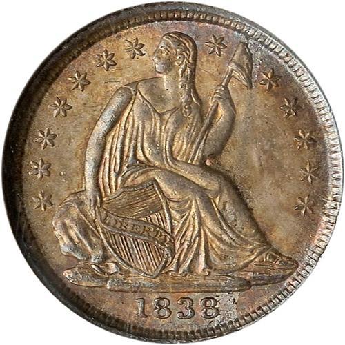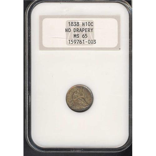 The Philadelphia Mint in 1838 added stars to Gobrecht's "starless" motif of 1837 and continuing through November 1840, created the familiar (and short-lived) "no drapery" Type. It was produced in only three calendar years. The first year 1838 enjoys large collector interest which we suspect arises from the constant availability in nice frosty Mint condition coins like the present specimen. For the collector who wants to add a superior bit of Americana to his or her coin collection. Both sides are naturally toned, both sides enjoy basking in the comfort of full frosty originality. While this isn't the single finest-graded 1838 No Drapery half dime, it is certain to please anyone who studies it. Bids $1700 and trends $2500.