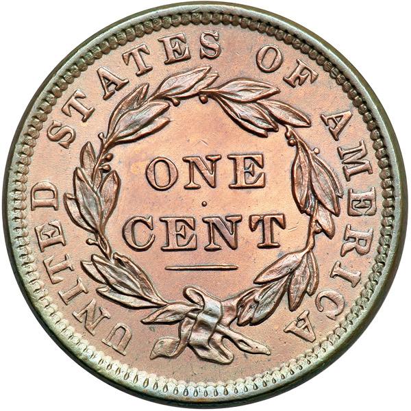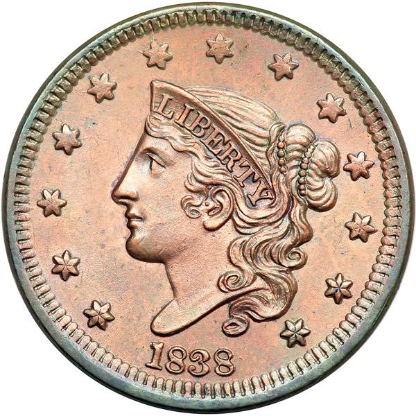 1838 N-1 R1 AU55. A frosty mint state piece that was dipped and is retoning greenish steel brown on the highpoints. Nice luster and no notable marks. E-MDS with fine radial die flowlines covering the fields. The triple peaks on the 1 are clear.