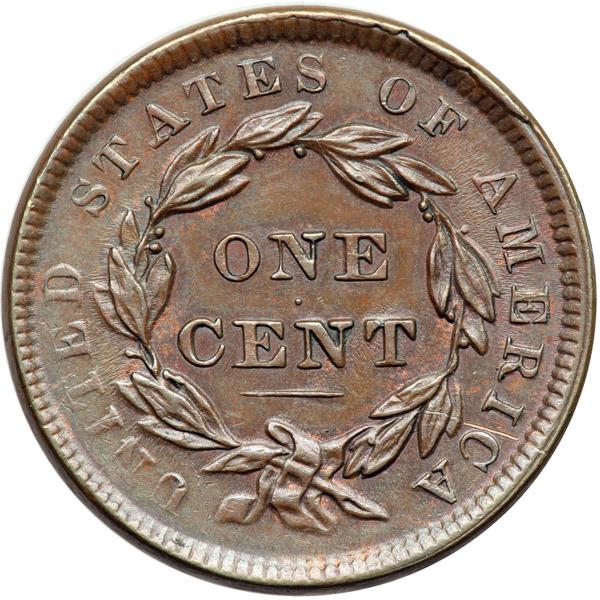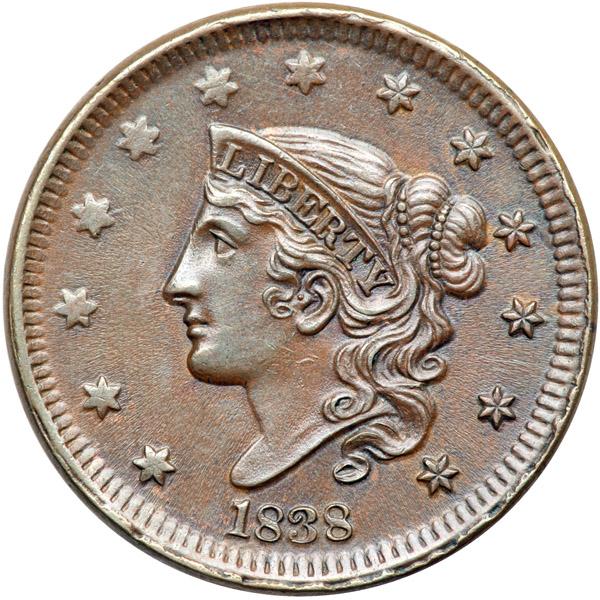 1838 N-1 R1 AU58. Glossy medium chocolate brown with traces of faded mint red showing on the reverse. NO spots or stains. The only notable mark is a pinscratch between the I and C in AMERICA. LDS with numerous clear rim cud breaks on both sides, including a strong one at OF. Die lapping has severely weakened the tops of UNIT. A neat die state of a relatively common die variety.