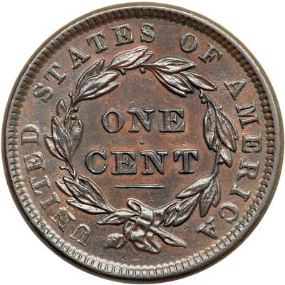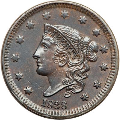 1838 N-1 R1. PCGS graded MS-61 Brown. Sharpness near mint state but this cent was lightly cleaned and is retoned a lustrous dark olive and steel with traces of frosty reddish steel brown in a few of the protected areas. A thin planchet lamination at NI in UNITED is the only mark. Nicely struck MDS showing rim cud breaks from star 6 to near star 8, at star 1, and under the 18, plus some tiny ones under star 13. Our grade is net AU50.
