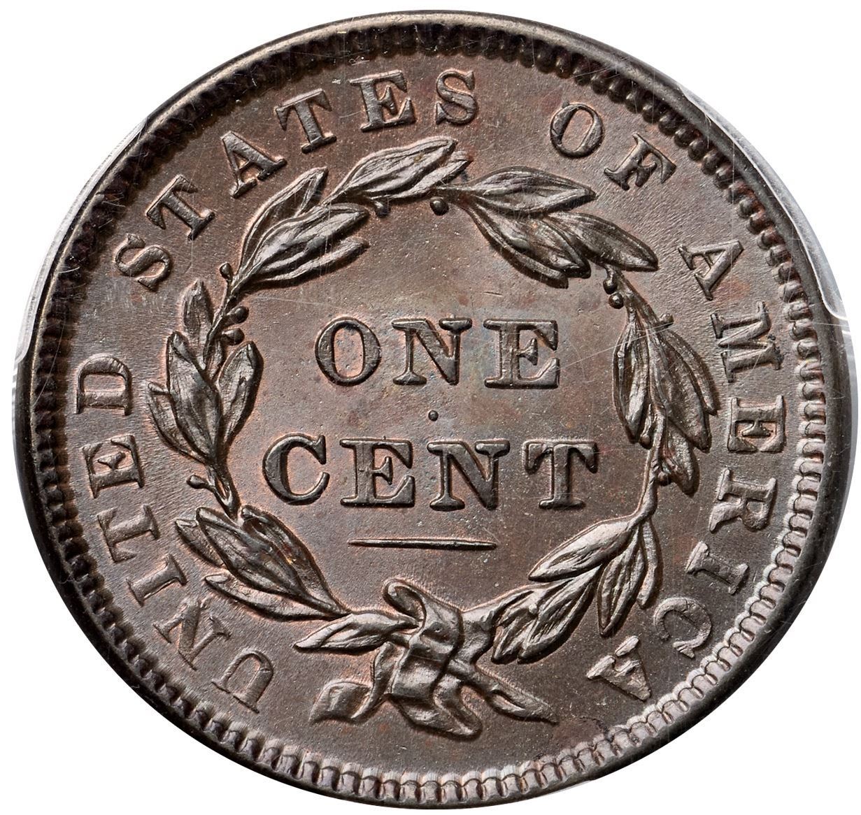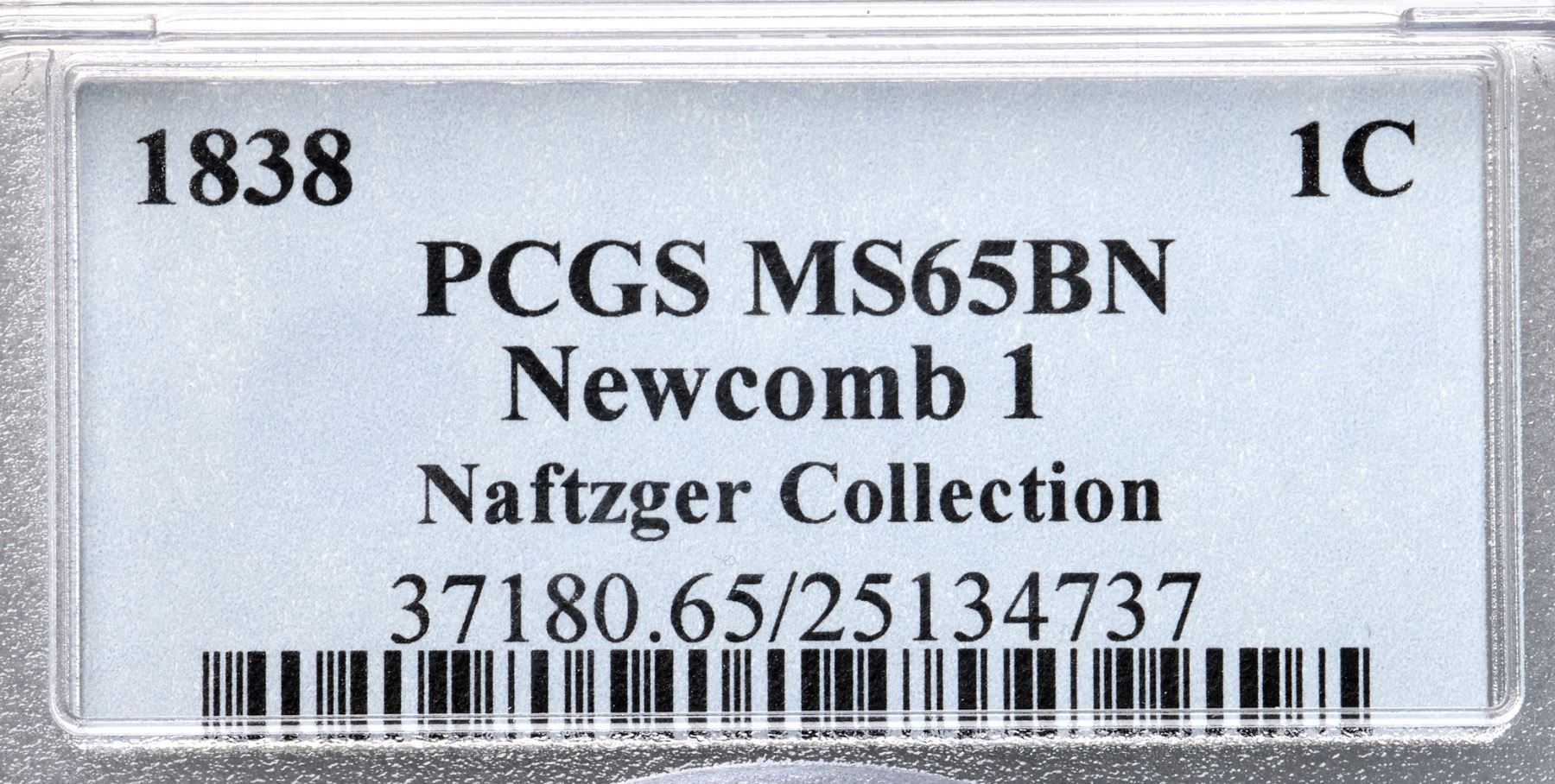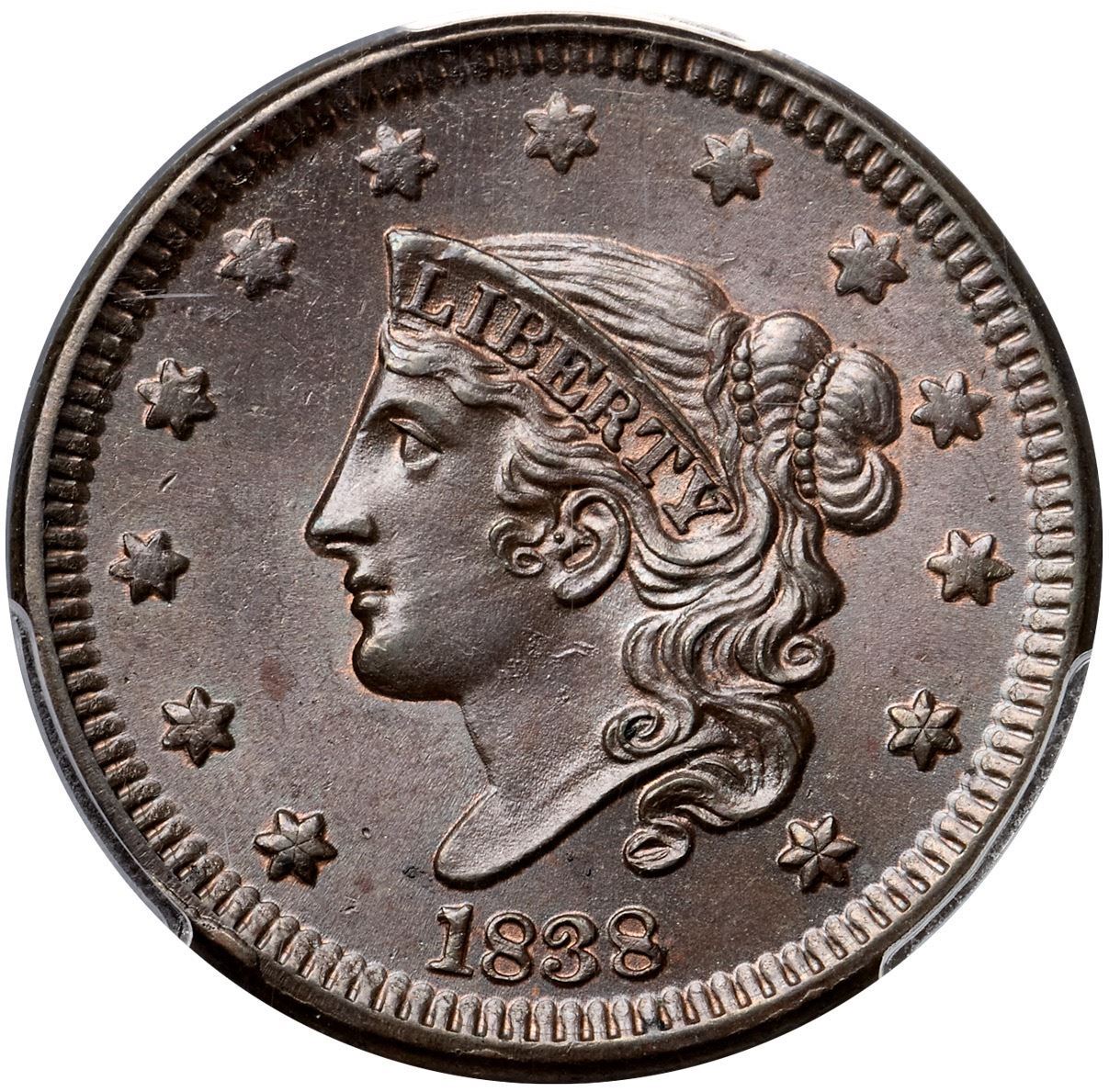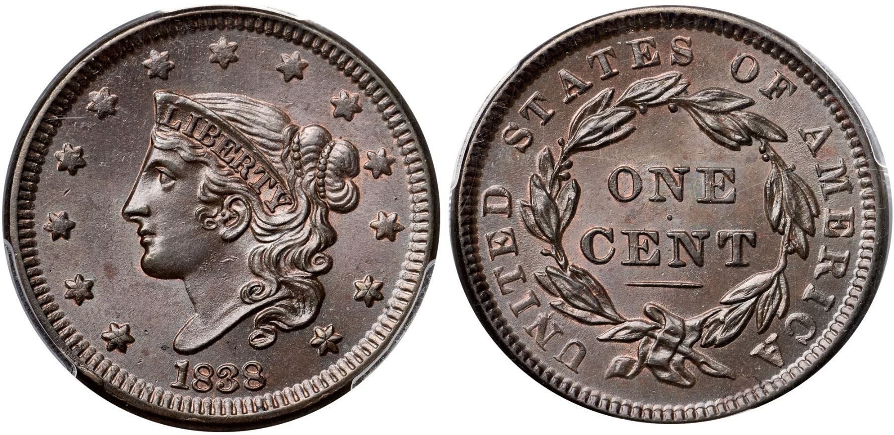1838 N-1 R1 PCGS graded MS65 BrownLustrous light olive and bluish steel with peeps of faded mint color remaining on both sides. Satiny mint frost covers this cent and the eye appeal is very nice. The only marks, and they are trivial, are a speck of crud in the field just off the tip of the bust, a very faint spot of reddish brown toning in the field midway between the chin and star 2, and a tiny splash of crud at the dentils off the end of the wreath stem. E-MDS with fine die flowlines in the fields and a clearly defined rim cud break at star 1. Called MS65 Choice and tied for CC#1 in the Noyes census, his photo #20977. He also listed this piece as MS63 under photo #55042. Either way it's a nice cent. Our grade is MS63+.Certificate Number: 37180.65/25134737Pedigree: Ex C. F. Clark (acquired by Dr. Shalowitz from a dealer on the bourse at the 1987 ANA Convention)-Dr. Robert J. Shalowitz 12/1987-R. E. "Ted" Naftzger, Jr.-Naftzger Estate, McCawley & Grellman Auctions/Goldbergs 2/1/2009:402-Terry S. Denman Collection