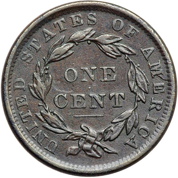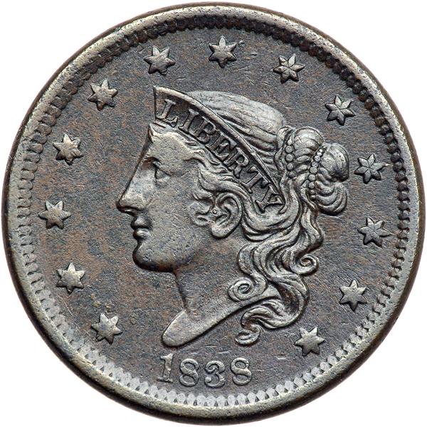 1838 N-10 R1 VF25. VF-25. Slightly sharper with microscopic roughness on both sides. No marks other than a shallow low spot over the C in CENT, as struck. Somewhat glossy dark chocolate and olive with lighter steel brown highpoints. MDS. The die crack through M now extends through the base of the A into the field toward the F. The forked crack to the M is now filled rather than sunken between the two cracks, and a new radial crack connects the left top of the M to the dentils above. DWH #1687.