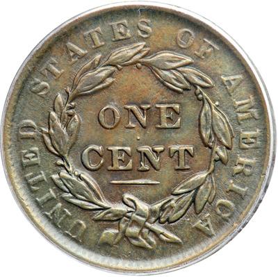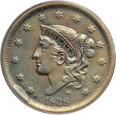 1838 N-11/13 R4 PCGS graded "Genuine". Sharpness EF40 but lightly cleaned, now retoned glossy light brown and bluish steel. No marks or other defects. Flowline luster covers the fields, and this cent offers nice eye appeal in spite of the light cleaning. LDS with a cud break at star 1 that nearly touches the outer points of that star. A decent example of this rare die state, perhaps improvable with a proper retoning. Our grade is net VF30.