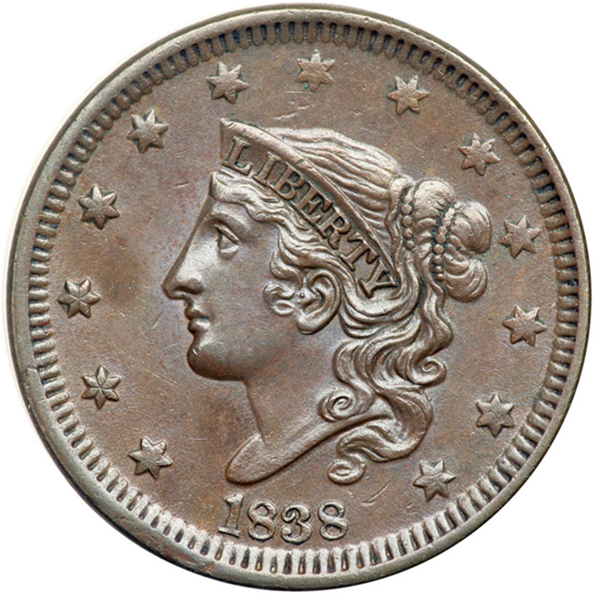 1838 N-12 R2 AU50. Frosty steel and chocolate brown. Satiny luster covers the fields and protected areas. The only defect is a shallow planchet lamination void from the A in STATES to the rim above, as struck. E-MDS. The doubling on the left half of the wreath (a doubled die) is clear.