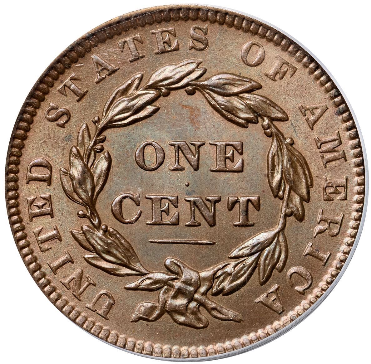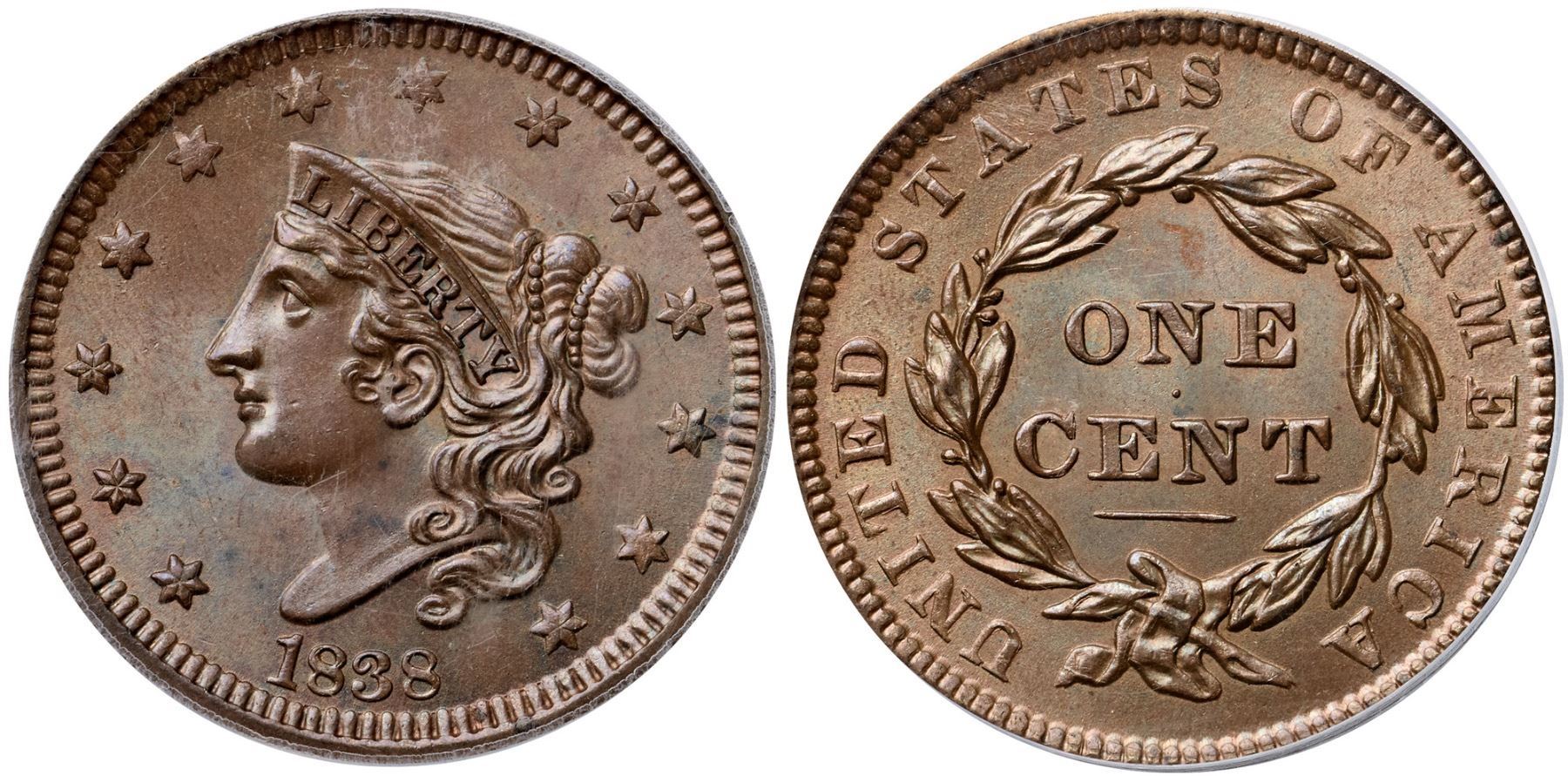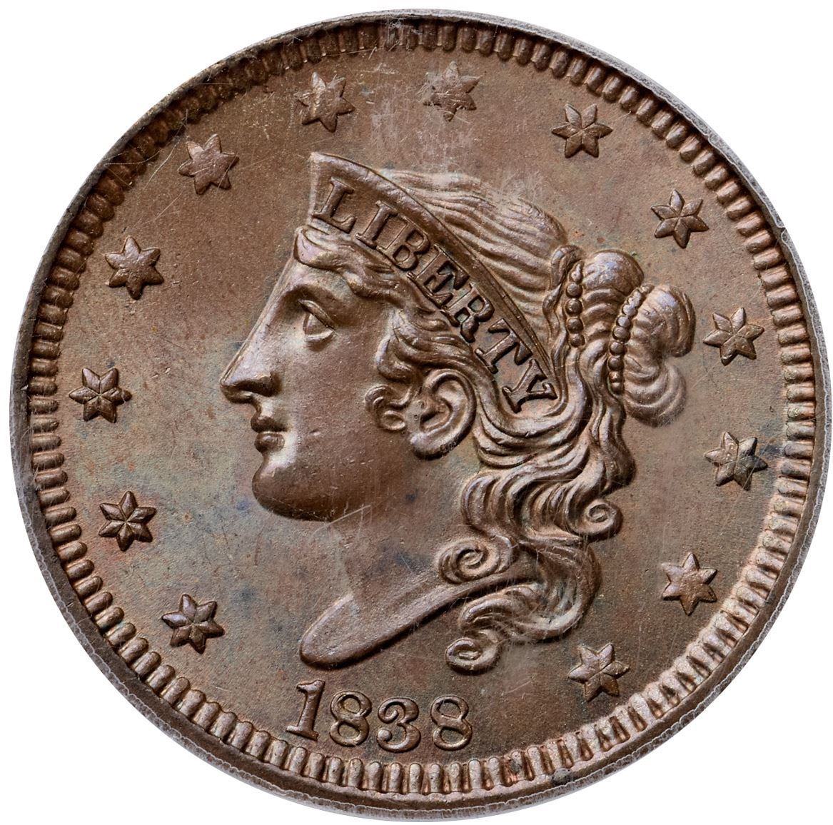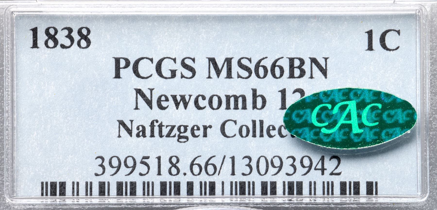 1838 N-12 R2 PCGS graded MS66 Brown, CAC ApprovedHighly lustrous light olive and bluish steel brown with a few faint wisps of slightly darker bluish steel toning on the neck and in the field under the chin. Hints of very faded mint color can be found in protected areas of the reverse. A small puff of dark bluish steel toning at the dentils right of star 11 is the best identifying mark. E-MDS and sharply struck except for weakness on the upper stars. The dentils are crisp around both sides and the doubling on the reverse (from a doubled die, not die bounce) is obvious on the left side of the wreath, especially at the berry and leaf under TE in UNITED. A satiny, really choice cent; a variety that is usually found in later die states with mushy details due to die wear. The PCGS grade and CAC approval attest to the superior eye appeal of this piece. Called MS62 and tied for CC#1 in the Noyes census, his photo #21739. Bland says MS60+ and tied for CC#2 among the confirmed examples in his census. Our grade is MS63+, close to MS64.Certificate Number: 399518.66/13093942Pedigree: Ex W. Allen, New Netherlands Coin Co. #44, 6/1954:196-Emanuel Taylor 10/1960-R. E. "Ted" Naftzger, Jr.-Naftzger Estate, McCawley & Grellman Auctions/Goldbergs 2/1/2009:431-Terry S. Denman Collection