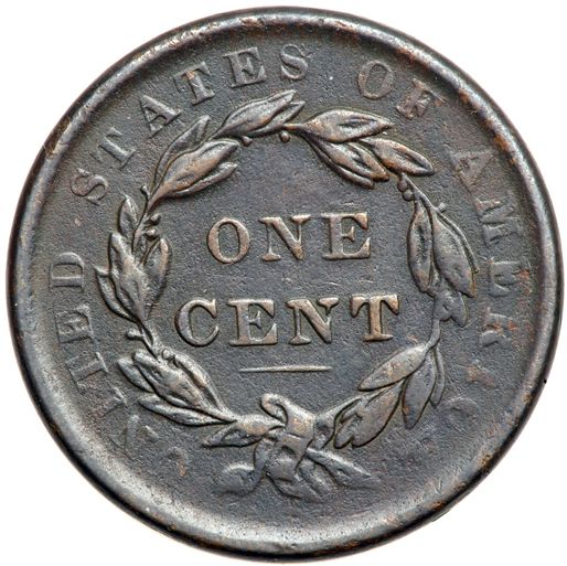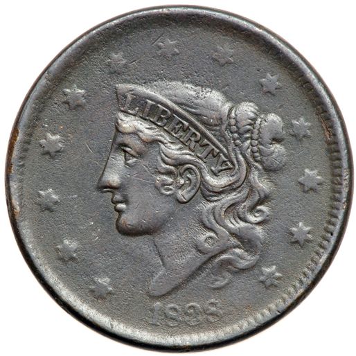 1838 N-16 R5- VF20. Sharpness EF40 but covered with microscopic granularity that holds back the natural gloss. No verdigris, and the only marks are a couple very tiny rim bruises, the stronger of these at star 3. Slightly glossy dark steel with slightly lighter chocolate toning on some of the highpoints on the reverse.