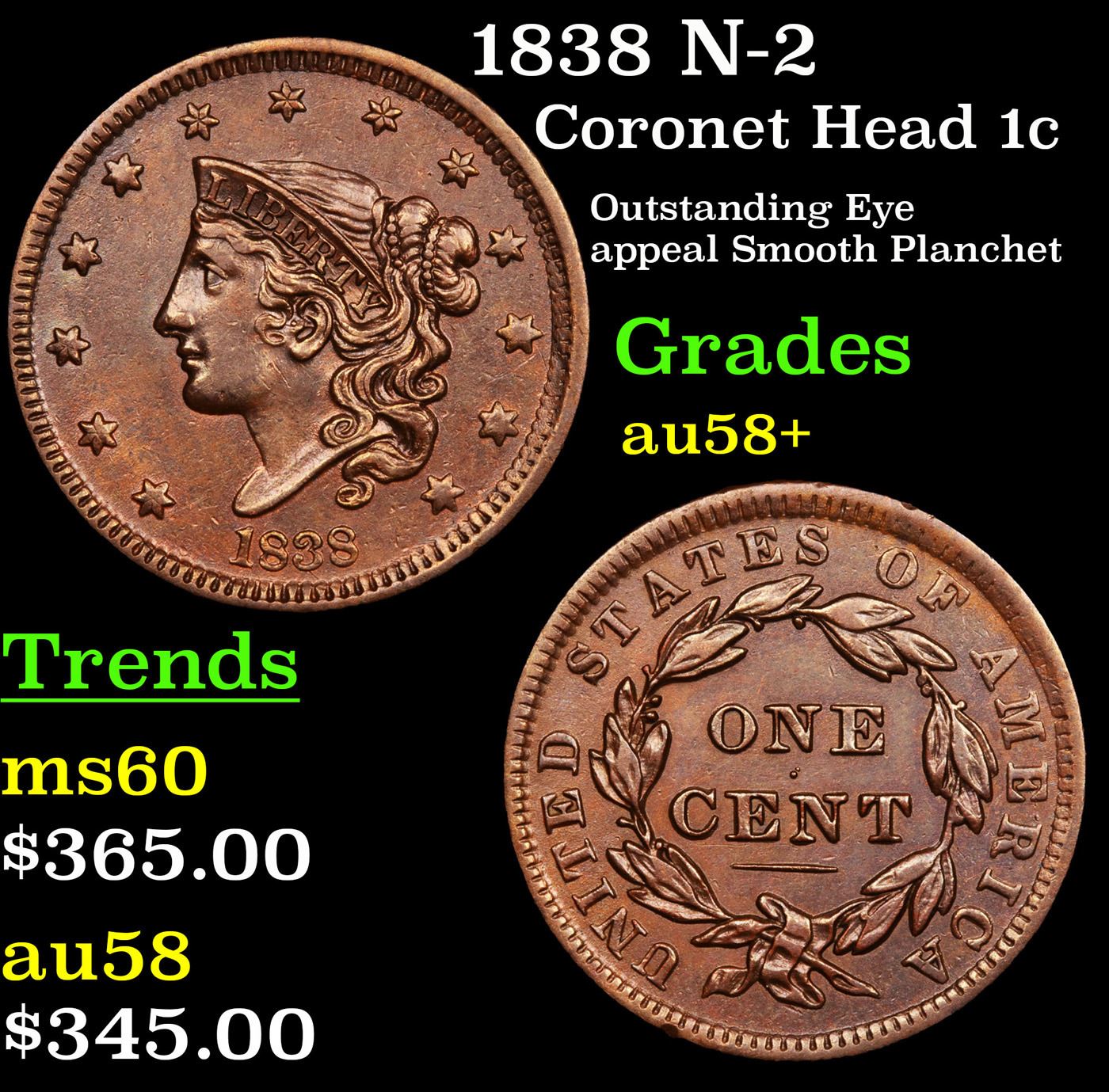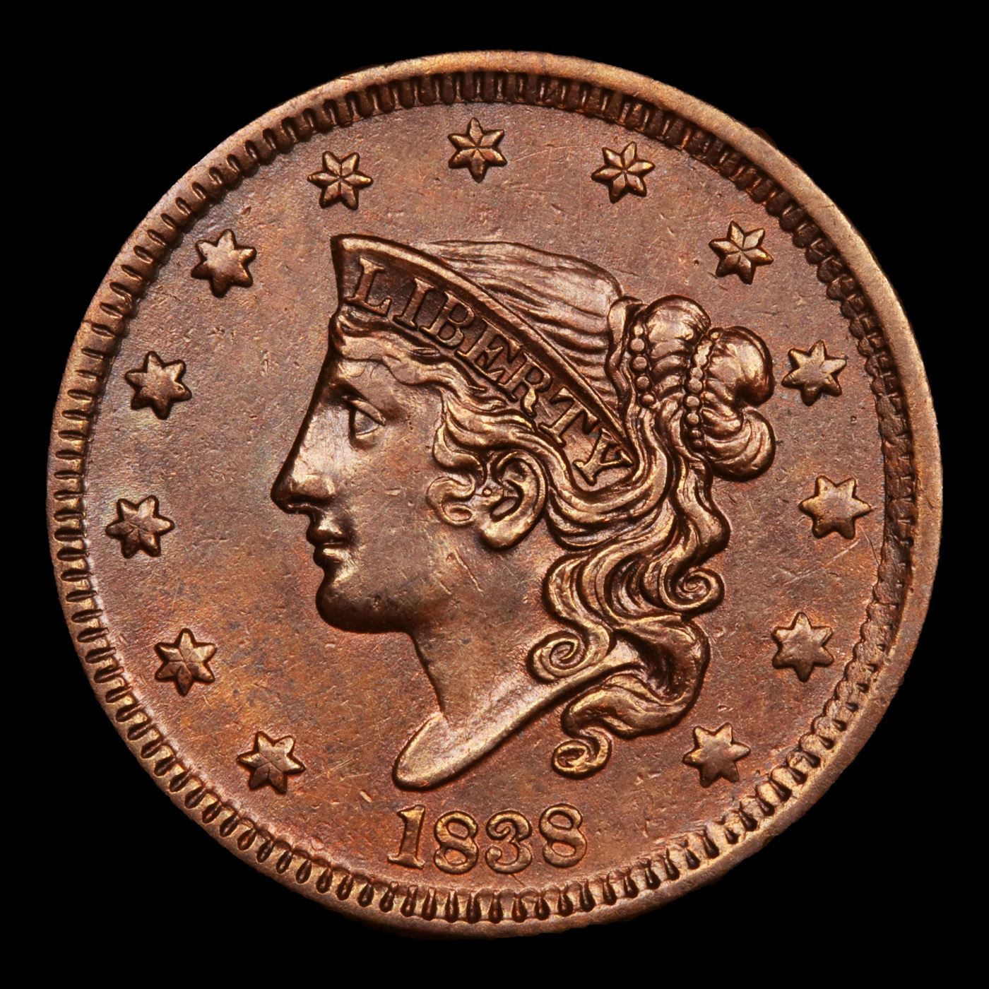 1838 N-2 Coronet Head Large Cent 1c Grades Choice AU/BU Slider+.