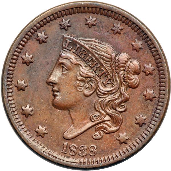 1838 N-3 R1 EF40. EF-40. Glossy reddish brown and chocolate. A small nick on the right side of the O in ONE and a speck of dark toning under the right end of the line below CENT are the best identifying marks. VEDS with all the fine die finishing lines clear, including at least a half dozen vertical die lines above the E in CENT. DWH #1662.