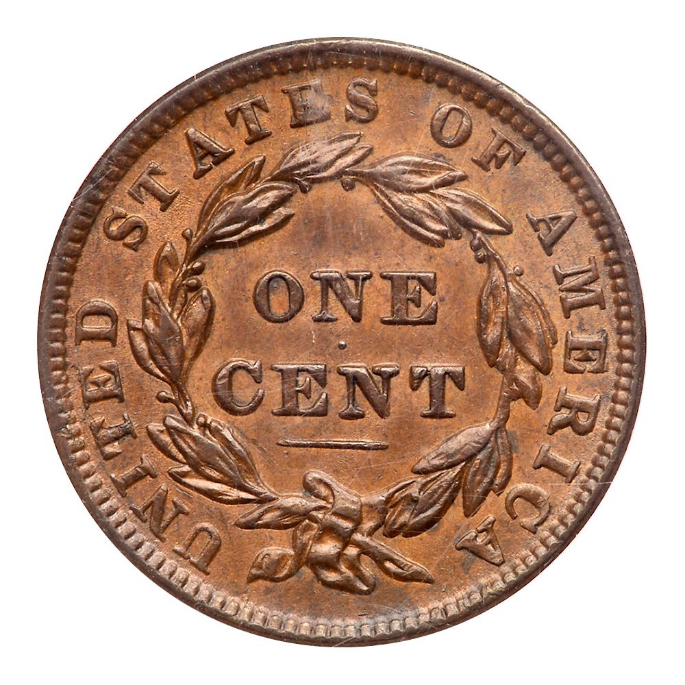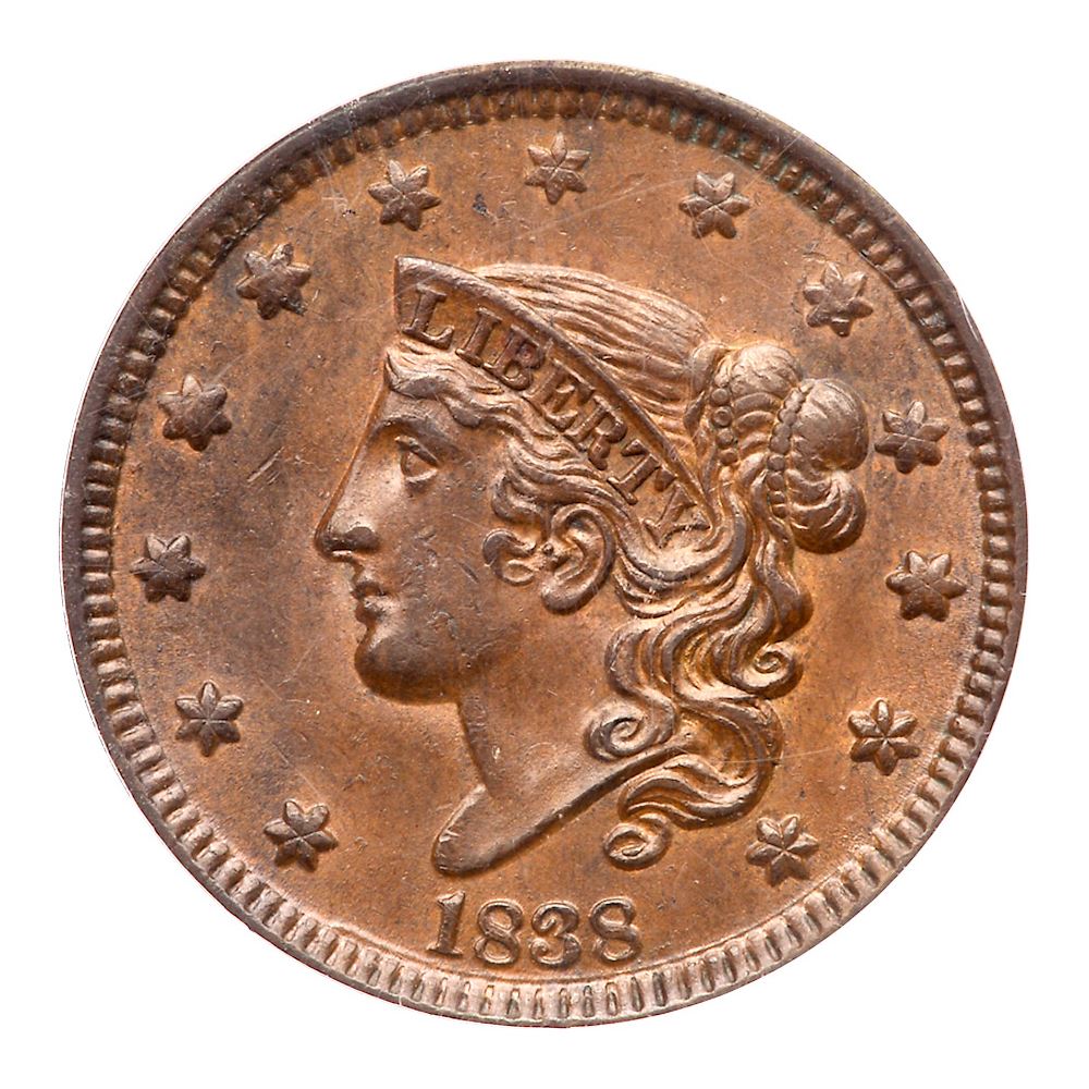 1838 N-4 R2 PCGS graded MS62 Brown. Frosty tan and light steel brown with slightly darker steel brown toning on the highpoints. Hints of very faded mint color can be found in a few of the most-protected places. Looks mint state but there is a hint of friction on the highest points of the devices. No spots or stains, only trivial contact marks. E-MDS with a die crack from the dentils over star 9 down to the hair bun. Our grade is AU50+. Estimated Value 250 - UP