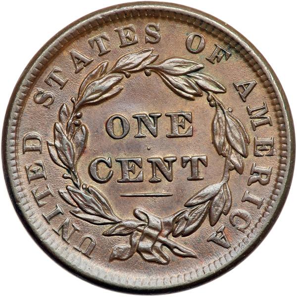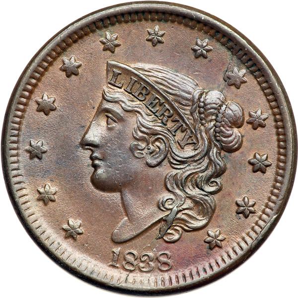 1838 N-4 R2. PCGS graded MS-63 Brown. Choice glossy light steel brown and chocolate with frosty luster in protected areas and some reddish brown toning between the date and star 13. No spots, a very tiny rim nick over the second T in STATES is the notable mark. M-LDS+ with a rim cud break in the dentils below 83, but this cud does not reach up to the tip of those dentils. The die cracks and rim cud of the earlier state are clear. Called MS60 and tied for CC#16 in the Noyes census, his photo #36783. Our grade is AU58. Pop 3; 5 finer in Brown. DWH #1671.
