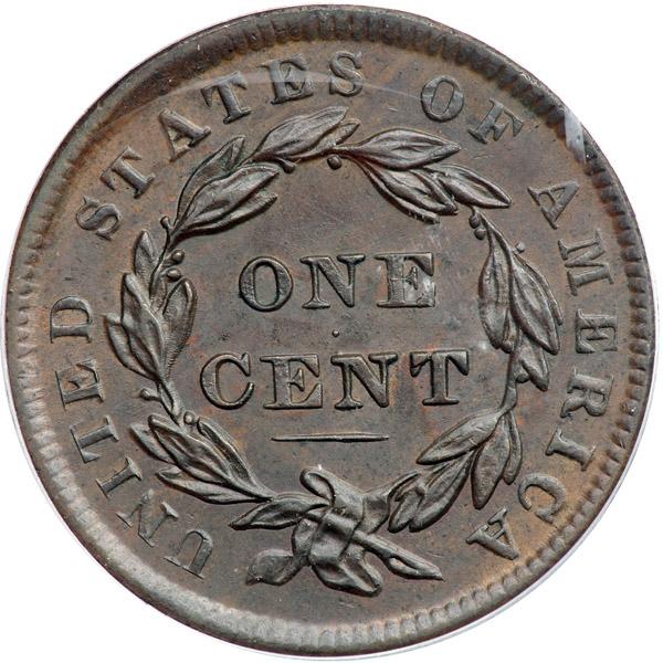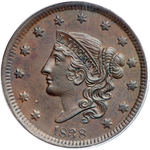 1838 N-6 R1. PCGS graded MS-63 Brown. Frosty olive and steel with hints of very faded mint color remaining on the reverse. A subtle splash of reddish chocolate and dark olive toning shows between stars 3 & 4. No additional marks on attractive, satiny surfaces. LDS. The PCGS label indicates this piece is from the Newcomb-7 dies, but that is incorrect. Our grade is MS60.