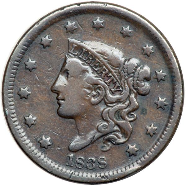 1838 N-7 R1 Masonic Token F12. The cent obverse is F12 and the Masonic side grades EF40. Attractive glossy medium brown and chocolate with smooth surfaces. Could be N-7 or N-10, as if that really matters. The reverse was smoothed off and skillfully engraved into a Masonic token made for George F. Dilley of the McMillan Chapter No.19. The engraving work is beautiful. DWH #3391.