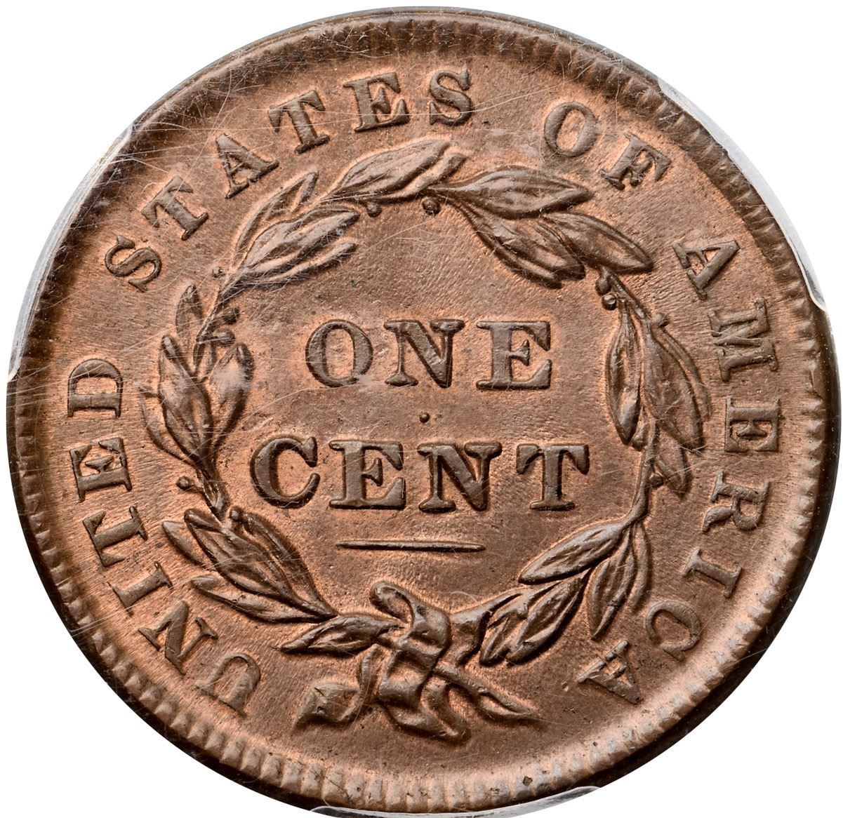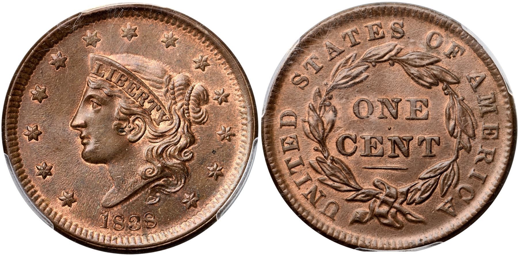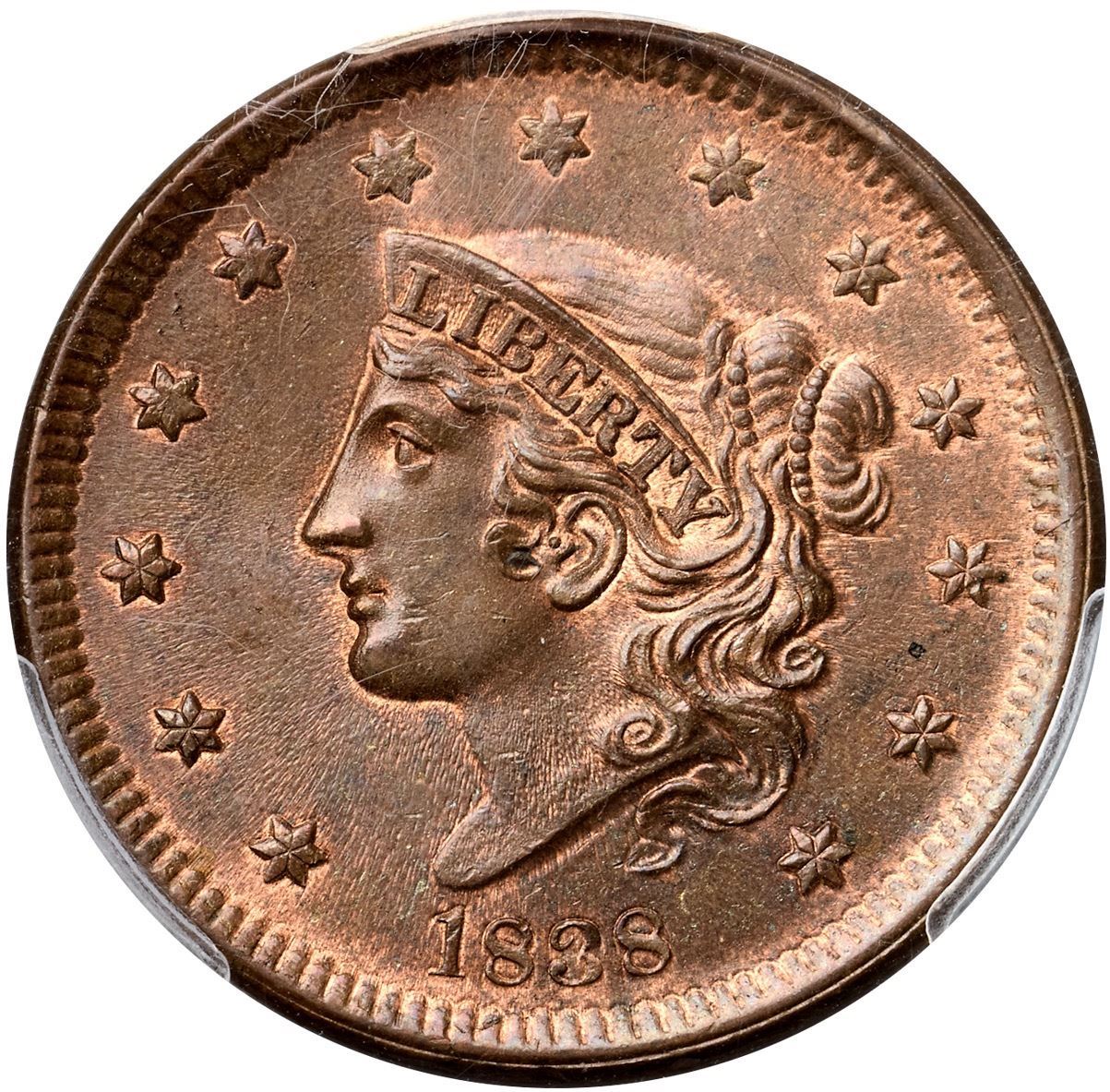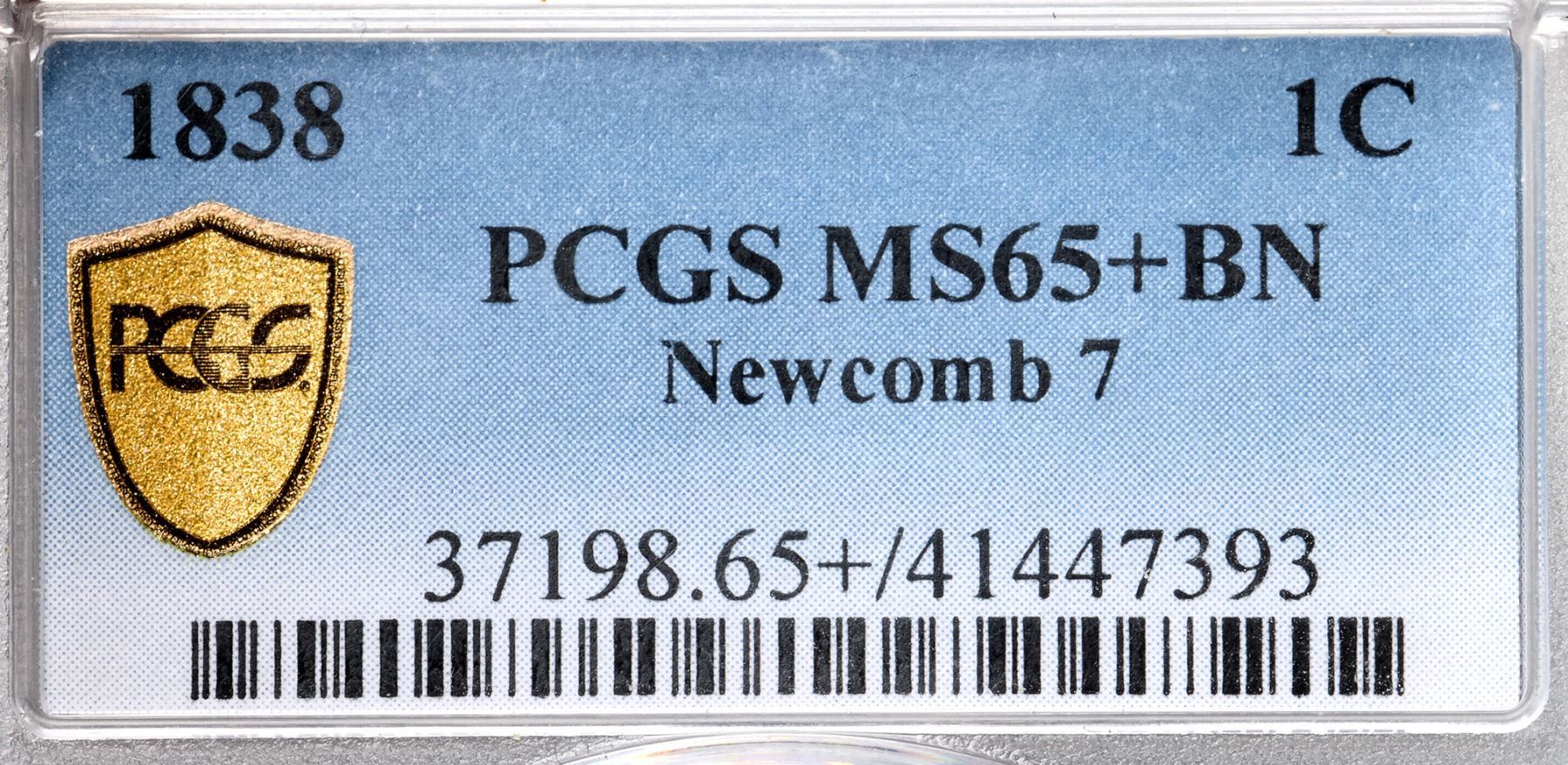 1838 N-7 R1 PCGS graded MS65+ BrownChoice lustrous light olive and steel brown with at least 15% of both sides showing mint red. The only marks are a speck of dark toning or dirt over star 12, a couple tiny ticks right of the lower lip, and a few microscopic ticks over star 4. Only the speck is visible to the unaided dye, and it is trivial. M-LDS, die state b late. The die line to the base of the F is weak but still visible and there is a tiny, previously unreported rim cud at ME. Our grade is MS64, in the lower end of the condition census for the variety.Certificate Number: 37198.65+/41447393Pedigree: Ex Stack's/Bowers 3/2021:1592-Terry S. Denman Collection