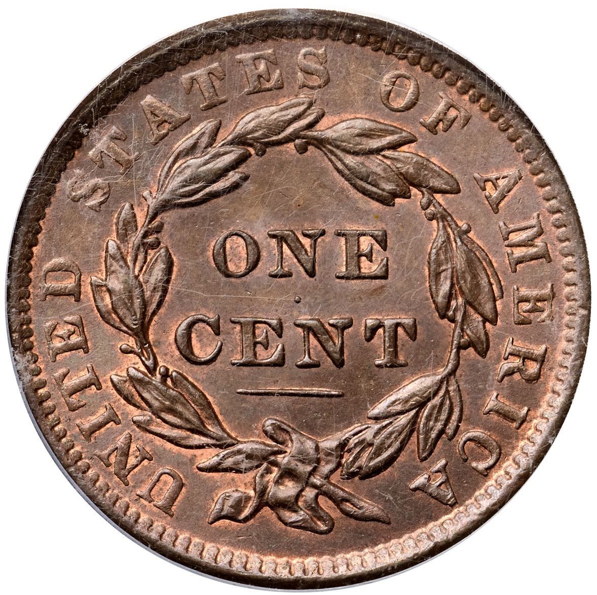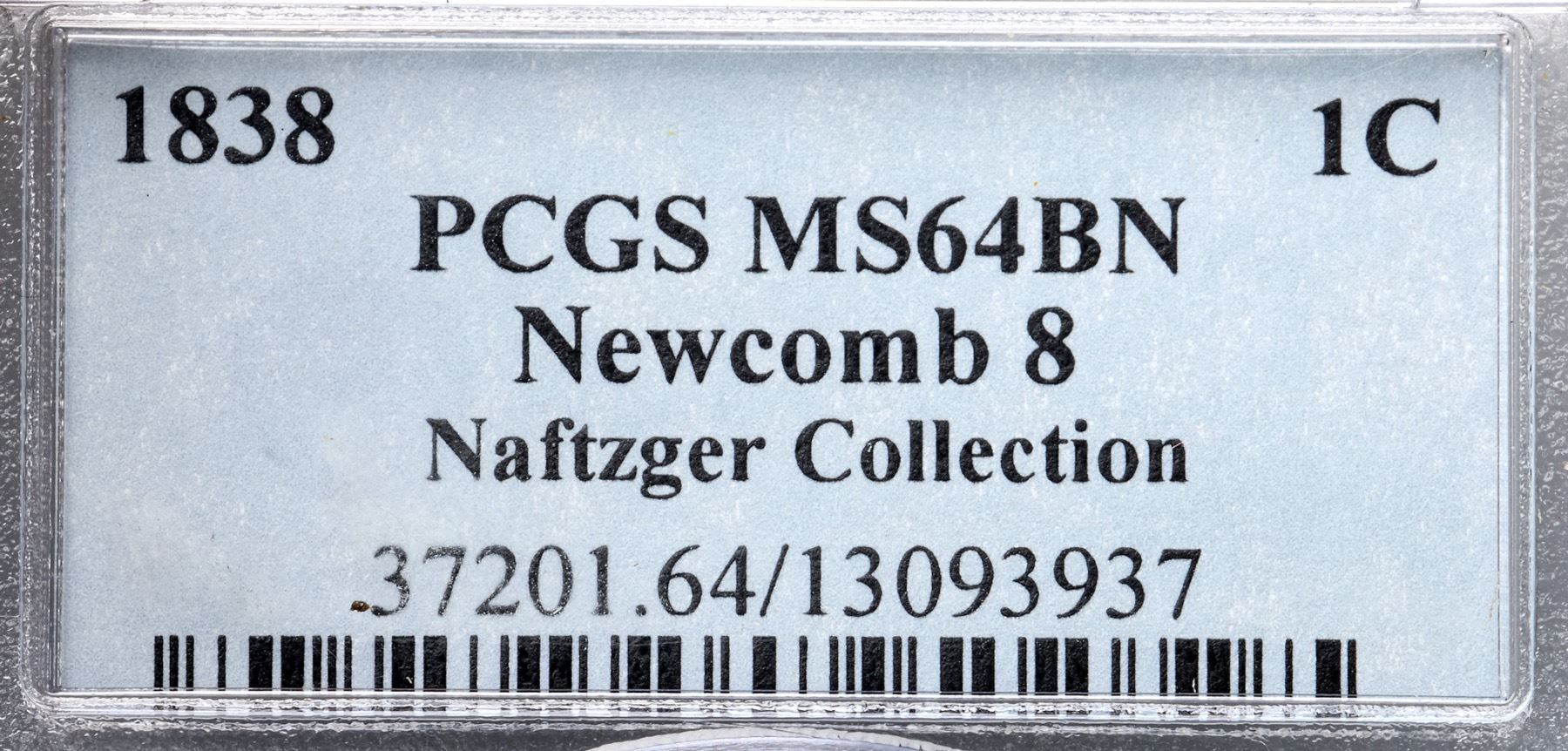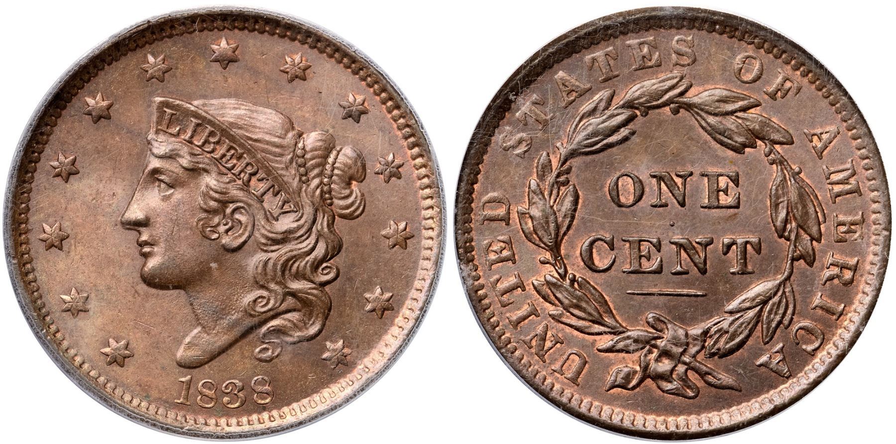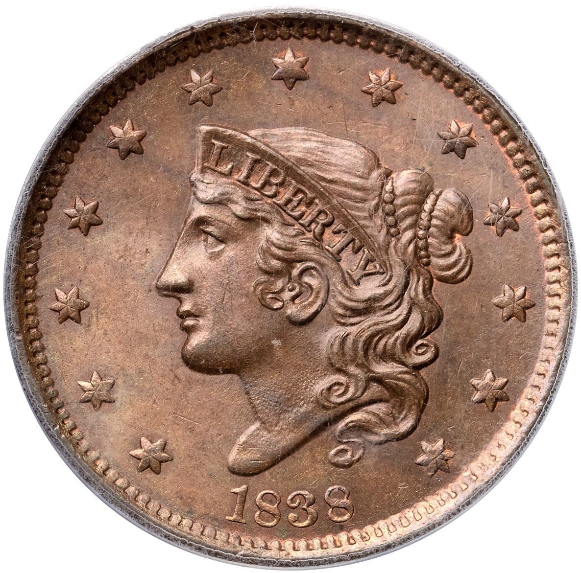 1838 N-8 R1 PCGS graded MS64 BrownFrosty light steel brown with a few very faint streaks of slightly darker steel brown on the obverse. Traces of original mint red show on both sides, especially on the reverse where nearly 5% of that side shows some mint color. The surfaces are lustrous and nearly void of marks. A speck of dark toning under the second 8 and a nick on the bottom of the first S in STATES are the best identifying marks, and both are trivial. E-MDS, die state b. The fields are satiny from microscopic die flowlines but the recutting at RIC remains clear. The earlier die line at stars 5 & 6 is gone. Called MS63 and tied for CC#2 in the Noyes census, his photo #21824 (the CC#1 example resides in the ANS Museum). Our grade is MS63. (The holder is scuffed.)Certificate Number: 37201.64/13093937Pedigree: Ex Knightsbridge (London)-1987 ANA bourse-Douglas F. Bird 4/16/1988-R. E. "Ted" Naftzger, Jr.-Naftzger Estate, McCawley & Grellman Auctions/Goldbergs 2/1/2009:423-Chris McCawley-Terry S. Denman Collection