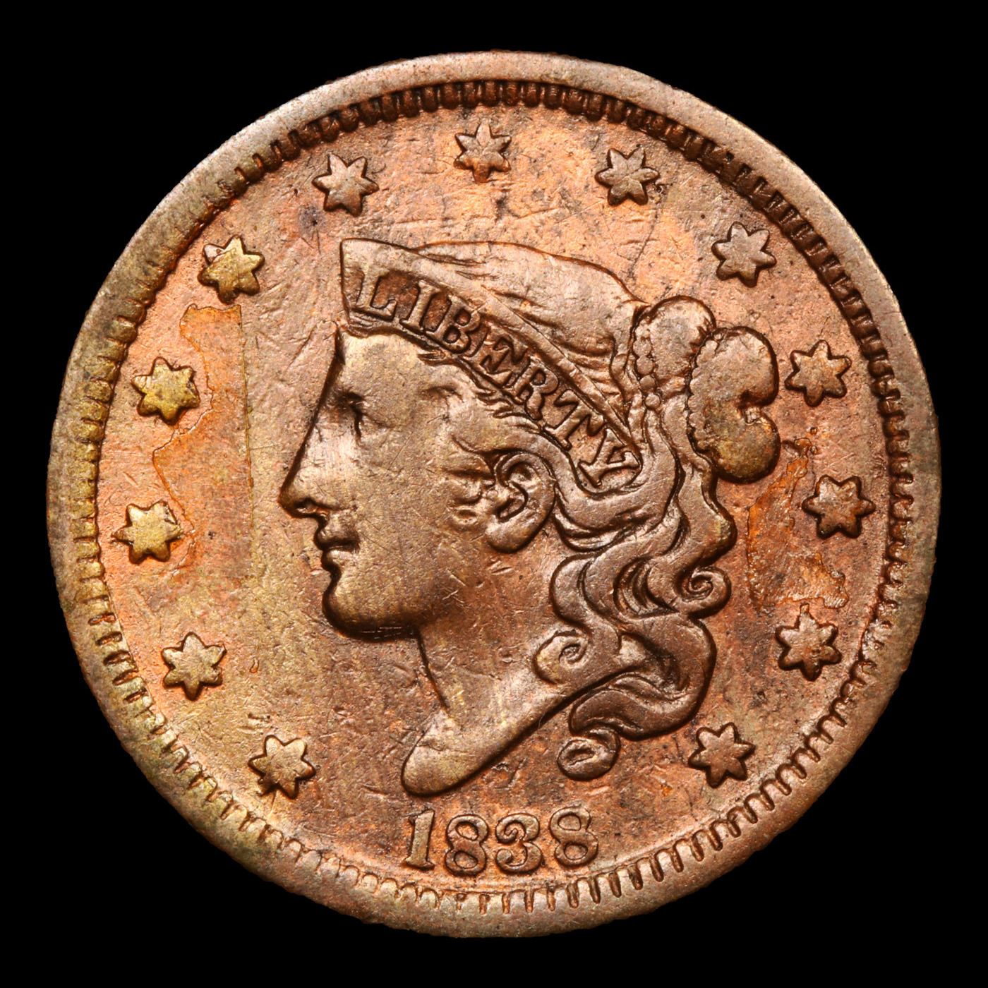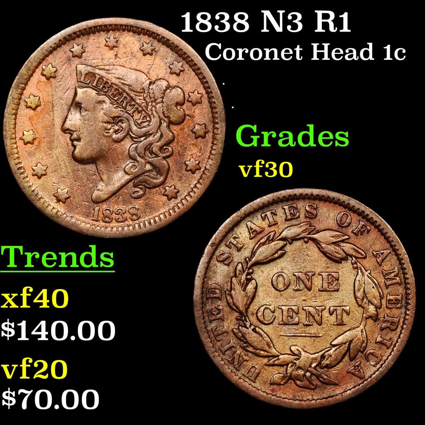 1838 N3 R1 Coronet Head Large Cent 1c Grades vf++.