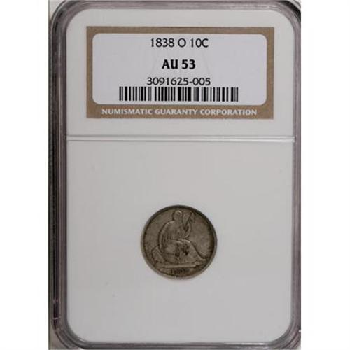 <B>1838-O 10C No Stars AU53 NGC.</B></I> Natural light gray surfaces with some darker toning. The 1838-O is elusive in higher grades, much rarer than the 1837 No Stars issue.<BR><BR><B>Coin Engraver:</B> Christian Gobrecht<BR><BR><b>Shipping:</b> Coins & Currency (<a target="_blank" href="http://www.heritageauctions.com/common/shipping.php">view shipping information</a>)