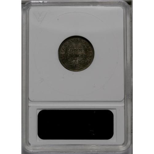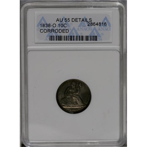 <B>1838-O<10C> No Stars--Corroded--ANACS. AU55 Details.</B></I> The 1838-O is significant as the first branch mint dime, and the only branch mint issue of the No Stars subtype. It is also scarce relative to other dates from the 1830s. This bold charcoal-gray piece is moderately granular and has a few light marks near the ribbon ends.