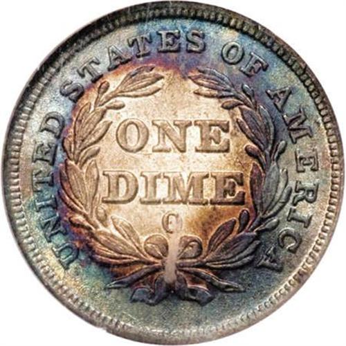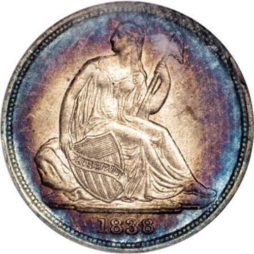 <B>1838-O 10C No Stars MS62 NGC.</B></I> Fortin-101. The mintmark is repunched south, and the obverse has a rim cud at 2 o'clock. One of Gerry Fortin's Top 100 varieties. Both sides of this lustrous example are attractively toned in concentric shades of golden-violet and turquoise around the peripheries, framing the light gray centers. the design elements are sharply impressed. Minutely granular, and the right obverse field has a hair-thin mark. The only New Orleans issue of this short-lived No Stars type. Population: 8 in 62, 18 finer (11/07).<BR><BR><B>Coin Engraver:</B> Christian Gobrecht<BR><BR><b>Shipping:</b> Coins & Currency (<a target="_blank" href="http://www.heritageauctions.com/common/shipping.php">view shipping information</a>)