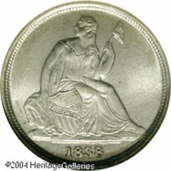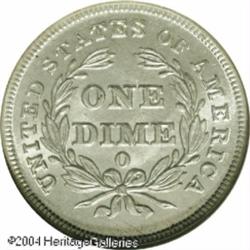 1838-O 10C No Stars MS66 NGC. A well struck repres <B>1838-O 10C No Stars MS66 NGC.</B></I> A well struck representative that features bright silver-gray patina, impeccably preserved surfaces, and bold luster. The first dime issue from the New Orleans Mint, and the only O-mint No Stars, Small Wreath Dime issue. By far the scarcest issue of the short-lived type. The 1838-O is a scarce date that is one of just two No Stars issues and the first dime from New Orleans, being struck in the same year as the famous and rare 1838-O Half Dollar. It was saved in far fewer numbers than one might expect for an issue of such importance. A problem-free coin that would fit nicely into either a better date type collection or a high grade date set. <BR><BR><B>Important notice:</B> Heritage usually auctions material at the rate of 200-250 lots per hour. On some occasions eBay Live bid software or the Internet may not be able to keep up with the pace of the auction. We recommend placing a realistic absentee bid now as insurance to avoid disappointment. Occasionally the auctioneer may eliminate or reject an eBay Live bid, and the auctioneer may also reopen a lot after the close of the eBay live bidding (usually because we missed an audience bid), and may reject your bid even if it shows you as the winning bidder. By bidding via eBay Live, you agree that Heritage may award the lot to another bidder at its sole discretion under the circumstances described above or any other reasonable circumstances. Since eBay bids are not shown to us until we open the lot on the floor, we treat those bids just like floor bids. In most cases the floor responds before the eBay bid is presented to us, due to Internet lag time, so for consistency we have made it a policy that floor bids are always considered first over tie eBay live bids. Also please note that all Heritage lots purchased through eBay Live carry a 20% Buyer's Premium. Please make sure you read the Terms and Conditions before you bid. This lot is being auctioned in conjunction with a live floor auction by Heritage Galleries & Auctioneers. All final auction and invoice information will be supplied by Heritage Galleries & Auctioneers, and all other information should be considered preliminary. Lot:5709