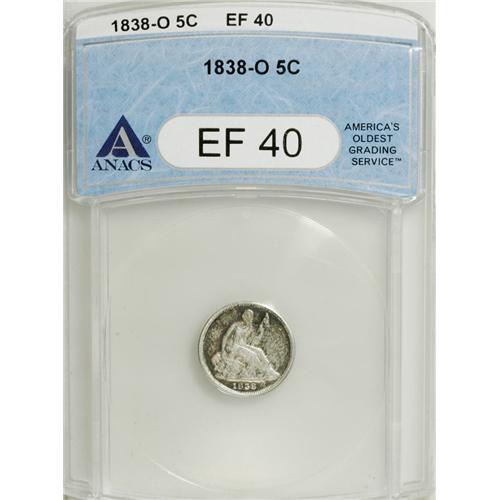 <B>1838-O H10C No Stars XF40 ANACS.</B></I> The 1837 No Stars issue is plentiful in high grades, but few 1838-O dimes appear to have been set aside, and the mintage of 70,000 pieces was low to begin with. This sharp example has attractive apple-green and tan-brown peripheral patina, and the only mentionable mark is tick above the D in DIME.<BR><BR><b>Shipping:</b> Coins & Currency (<a target="_blank" href="http://www.heritageauctions.com/common/shipping.php">view shipping information</a>)