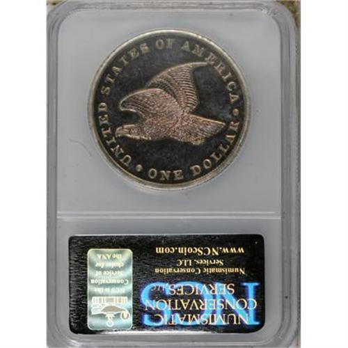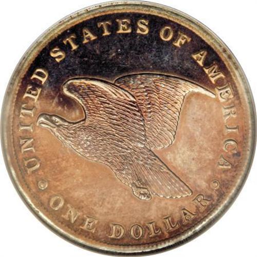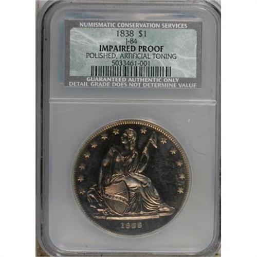 <B>1838 PS$1 Name Omitted, Judd-84 Restrike, Pollock-93, R.5--Polished, Artificially Toned--NCS.</B></I> <B>Impaired Proof.</B></I> Silver. Reeded Edge. Die Alignment III (head of Liberty opposite the NE of ONE; or equivalently, coin-turn with the eagle flying level). Both sides are unnaturally bright, even for a proof striking, with tinges of orange-gold and violet toning in the recesses. Classified as a "restrike," this term seems superfluous as it appears that all 1838 Dollars that exist today are restrikes. No "original" 1838 Dollar has been authenticated to our knowledge, and it is believed by some numismatists that no 1838 Dollars were actually struck in 1838. If this is correct, then all 1838 Dollars are restrikes.<BR>Of the three die cracks normally found on the reverse, only the short crack connecting the bases of the letters LAR (of DOLLAR) can be detected here with any certainty. The presence and size of these die cracks, when compared with other Gobrecht Dollars struck with the same reverse die, indicate that this piece was probably made during one of Linderman's two terms of office. Most Gobrecht Dollar restrikes are known to have been made between 1857 and 1860 (during Snowden's term of office), or from 1867 to 1869 (during Linderman's first term), or from 1873 to 1878 (during Linderman's second term as U.S. Mint Director). Even though their origin is a bit hazy, the scarcity of these 1838 Restrikes when combined with the popularity of the Gobrecht design make them sought-after numismatic commodities. <BR><BR><b>Shipping:</b> Coins & Currency (<a target="_blank" href="http://www.heritageauctions.com/common/shipping.php">view shipping information</a>)