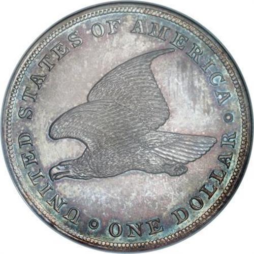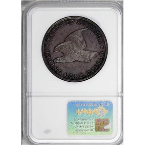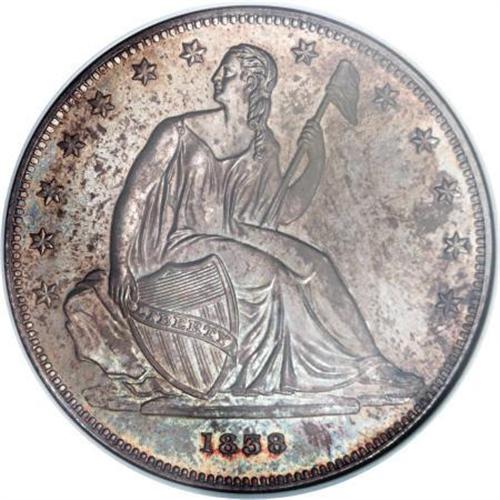 <B>1838 P$1 Name Omitted, Judd-84 Original, Pollock-93, R.5, PR64 NGC.</B></I> Silver. Die Alignment III (coin turn, center of Liberty's head opposite the N in ONE). Although it is not identified on the label, this coin is the Judd-84 plate coin that is photographed in the 8th and 9th editions of the new Judd book on patterns. Generally, the coin exhibits medium brown toning on both sides; however, when the coin is tilted in the light at the correct angle, there appears a ring of color that surrounds the reverse legend and a faint circular toning mark midway between the eagle's right wing and the ES in STATES. Both of these toning characteristics are duplicated in the Judd book photos.<BR> Unlike the circulation issues of 1836 (Judd-60) and 1839 (Judd-104), no 1838 dollars were intentionally made for public distribution. The main purpose of the 1838 dollars was to test two new design features: (1) a reeded edge, and (2) the removal of the 26 stars from the reverse of the 1836 dollar and the placement of 13 stars around the obverse. It is clear that the dies for the 1838 dollar were made in 1838; however, it is not certain how many (if any) 1838 dollars were actually struck in 1838. Only one original specimen is known, and this coin is a part of the U.S. Mint Collection now retained by the Smithsonian. However, the Smithsonian specimen exists in Die Alignment IV orientation (not Alignment I), and was struck from perfect (uncracked) dies. All 1838 dollars that have been observed in other museum collections or in private hands appear to be restrikes made in the late 1850s under the authority of Director James Ross Snowden, or in the late 1860s by Director H. R. Linderman. Like the present specimen, the restrikes were made to satisfy collector demand for these beautiful coins. The restrikes are generally found in Die Alignment III orientation (i.e., head of Liberty opposite the NE of ONE); however, a few restrikes were also made in Die Alignment IV. Although the exact mintage of 1838 dollars is unknown, recent estimates suggest that fewer than 250 coins were ultimately struck, and that only a small fraction of these coins survive today. The restrikes can be distinguished from the originals by the presence of a faint die crack through portions of MERI. Likewise, the current coin has a faint die crack through the top of the letters MERI in AMERICA.<BR><I>Ex: Rarities Sale (Bowers and Merena, July 1997), lot 242.</B></I> <BR><BR><b>Shipping:</b> Coins & Currency (<a target="_blank" href="http://www.heritageauctions.com/common/shipping.php">view shipping information</a>)