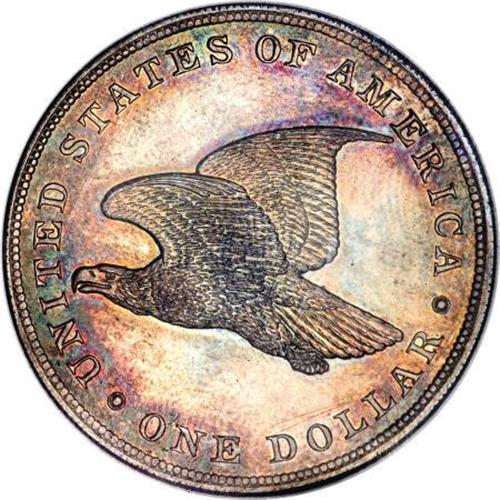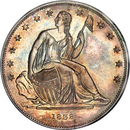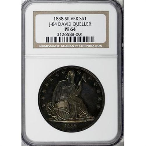 <B>1838 P$1 Name Omitted, Judd-84 Restrike, Pollock-93, R.5, PR64 NGC.</B></I> Silver. Die Alignment IV: Center of Liberty's head opposite the right side of the F in OF. The all-important reverse cracks that are present (or not) on 1838 Gobrecht dollars are microscopic on this piece. The only die crack that is evident with strong magnification connects the tops of MERI. Unlike later strikings of the 1838, no evidence of die cracks are seen at the base of LAR or TE. This slight die cracking dates this piece to the late 1850s, apparently produced after the 300 1838-dated dollars were struck in 1839. <BR> The minute die cracking on this piece dates its striking not through guesswork, but rather from direct evidence of other coins examined. A Die Alignment III coin (center of Liberty's head opposite N in ONE) is known that is overstruck on an 1859 Seated dollar. The significance of this is twofold. One, it has heavy die cracks. Two, it is a Die Alignment III coin. Since the reverse die cracks are heavier on Die Alignment III dollars than DA IV pieces, the conclusion must be that the DA III coins were struck after the DA IV coins. The date of the overstruck coin (1859) proves that the Die Alignment III pieces were struck in 1859 or later. Therefore, the Die Alignment IV coins were produced sometime prior to 1859. <BR> Like all the Queller Gobrecht dollars, this is a magnificent coin. The fields are sparkling and deeply reflective, qualities that are abundantly evident even through the bright rose, lime-green, and pale gray patina that covers each side. Sharply, but not fully struck, the only areas of softness are on several of the peripheral stars on the obverse and Liberty's foot. There are no obvious or distracting contact marks on this splendid coin--a rarity of the highest order and importance for the dollar collector. Census: 10 in 64, 5 finer (3/08).<BR><I>From The Queller Family Collection of Silver Dollars.</B></I><BR><BR><b>Shipping:</b> Coins & Currency (<a target="_blank" href="http://www.heritageauctions.com/common/shipping.php">view shipping information</a>)