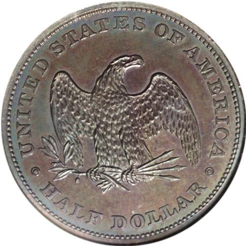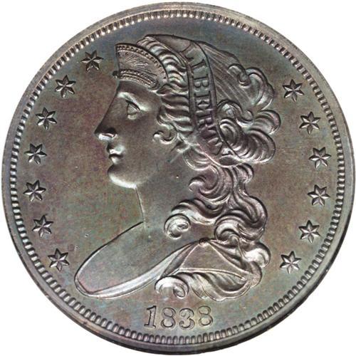 <B>1838 P50C Half Dollar, Judd-72, Pollock-75, R.5, PR65 NGC.</B></I> On the obverse a bust of Liberty, with luxuriant hair tresses, faces left with seven stars to the left and six to the right. Liberty wears a diadem and a ribbon inscribed LIBERTY. The date is below the bust. On the reverse an eagle grasps an olive branch and four arrows in its claws. Around, the statutory legend UNITED STATES OF AMERICA, and the denomination HALF DOLLAR below. Struck in silver with a reeded edge.<BR> With the completion of the Gobrecht dollar designs, Mint Engraver Christian Gobrecht turned his eye for coinage redesign to the next largest silver coin denomination, the half dollar. However, powerful forces of "consistency" were at work: The final half dollar design, as adopted in 1839, featured the Seated Liberty motif of the Gobrecht silver dollar obverse, combined with a pedestrian reverse rearrangement of the John Reich design in use with modifications from 1807 onward.<BR> This piece boasts superbly toned iridescent surfaces with electric blue predominating in the centers, with lilac, yellow, and orange at the borders. The pristine surfaces show only the tiniest of contact marks, and the strike is quite sharp. Two die lines run from the tip of the bust to a denticle beneath star 1. A bit of apparent die rust shows beneath the eagle's claws on the reverse.<BR><I>From The Jones Beach Collection.</B></I><BR><BR><b>Shipping:</b> Coin/Currency (<a target="_blank" href="http://www.heritageauctions.com/common/shipping.php">view shipping information</a>)