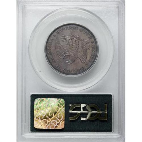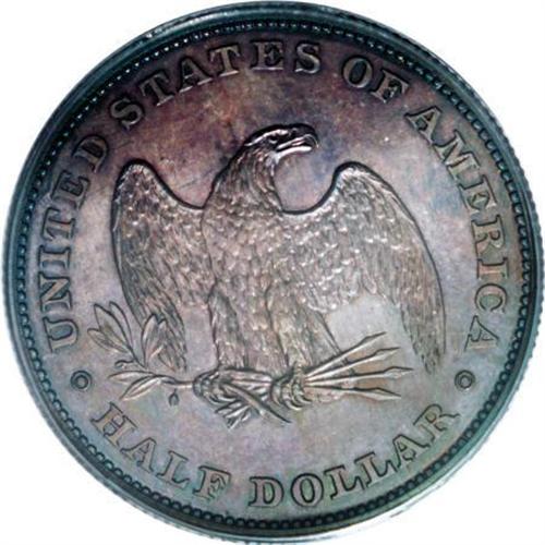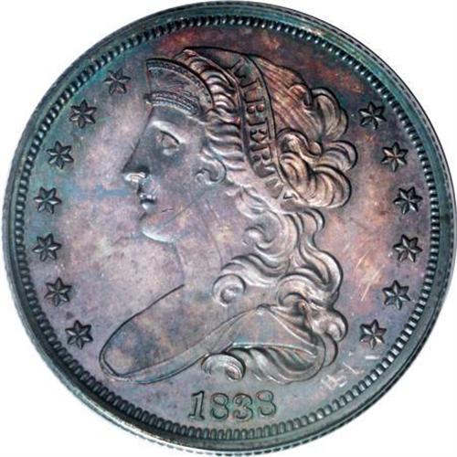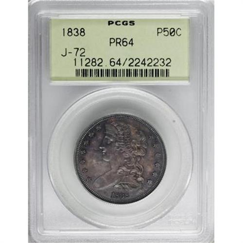 <B>1838 P50C Half Dollar, Judd-72, Pollock-75, R.5, PR64 PCGS.</B></I> A large bust of Liberty faces left, with stars and the date at the margins. The reverse features an eagle with spread wings. For many decades, the obverse design was attributed to William Kneass, but Gobrecht was almost certainly the engraver, as the portrait bears close resemblance to his 1838 to 1840 issued gold designs. Struck in silver with a reeded edge and medal turn. Plum-red, electric-blue, and sea-green toning endow this nicely struck near-Gem. The left obverse has a few thin toning streaks, but marks are nearly absent. Housed in an old green label holder. Population: 6 in 64, 3 finer (6/07).<BR><BR><b>Shipping:</b> Coins & Currency (<a target="_blank" href="http://www.heritageauctions.com/common/shipping.php">view shipping information</a>)