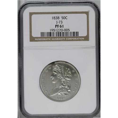 <B>1838<P50C> Half Dollar, Judd-73 Restrike, Pollock-77, R.5, PR61 NGC.</B></I> The obverse, once attributed to chief engraver William Kneass but more likely the work of assistant Christian Gobrecht, depicts a draped bust of Liberty facing left with thirteen stars around the periphery and the date below. Liberty is wearing a diadem and the scroll over her hair is inscribed with LIBERTY. A flying eagle facing left dominates the reverse. The legend UNITED STATES OF AMERICA and the denomination HALF DOLLAR are around the periphery. Struck in silver with a reeded edge. This slightly mishandled specimen is generally untoned and has a few marks and pinscratches scattered about. Usual die cracks are noticed on the right side of the reverse. <BR><BR><B>Important notice:</B> Heritage usually auctions material at the rate of 200-250 lots per hour. On some occasions eBay Live bid software or the Internet may not be able to keep up with the pace of the auction. We recommend placing a realistic absentee bid now as insurance to avoid disappointment. Occasionally the auctioneer may eliminate or reject an eBay Live bid, and the auctioneer may also reopen a lot after the close of the eBay live bidding (usually because we missed an audience bid), and may reject your bid even if it shows you as the winning bidder. By bidding via eBay Live, you agree that Heritage may award the lot to another bidder at its sole discretion under the circumstances described above or any other reasonable circumstances. Since eBay bids are not shown to us until we open the lot on the floor, we treat those bids just like floor bids. In most cases the floor responds before the eBay bid is presented to us, due to Internet lag time, so for consistency we have made it a policy that floor bids are always considered first over tie eBay live bids. Also please note that all Heritage lots purchased through eBay Live carry a 20% Buyer's Premium. Please make sure you read the Terms and Conditions before you bid. This lot is being auctioned in conjunction with a live floor auction by Heritage Galleries & Auctioneers. All final auction and invoice information will be supplied by Heritage Galleries & Auctioneers, and all other information should be considered preliminary. Lot:1810 <BR><BR><B>Winning Notification and Billing:</B> After the FINAL session in this auction is complete, Heritage will send e-mail and snail mail invoices. This process normally takes several days. All final auction and invoice information will be supplied by Heritage Galleries & Auctioneers, and all other information should be considered preliminary. <BR><BR>This auction will be conducted on a live auction floor and over the Internet through eBay Live. If you choose to place an absentee bid, please take a moment to <font color='#0000ff'><u><a href='http://pages.ebay.com/liveauctions/help/before/laabsentee.html'>learn how eBay Live absentee bidding works</a></u></font><font color='#000000'>