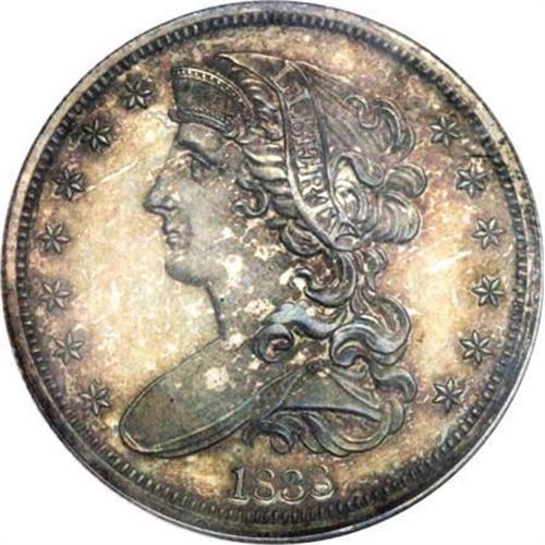 <B>1838 P50C Half Dollar, Judd-73 Restrike, Pollock-77, R.5, PR64 NGC.</B></I> On the obverse a bust of Liberty faces left with seven stars to the left and six to the right. Liberty wears a diadem and a ribbon inscribed LIBERTY. The date is below the bust. On the reverse an eagle flies in a plain field with the statutory legend UNITED STATES OF AMERICA around, and the denomination HALF DOLLAR below. Struck in silver with a reeded edge. Heavily cracked on the reverse, indicating a restrike from later decades (1850s through 1870s). Nicely mirrored in the fields, each side shows rich iridescent toning.<BR><BR><b>Shipping:</b> Coins & Currency (<a target="_blank" href="http://www.heritageauctions.com/common/shipping.php">view shipping information</a>)