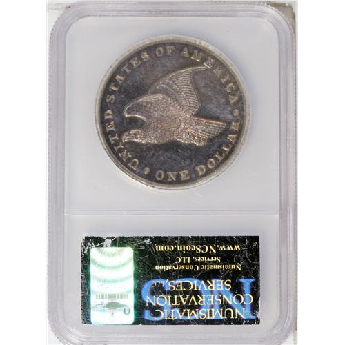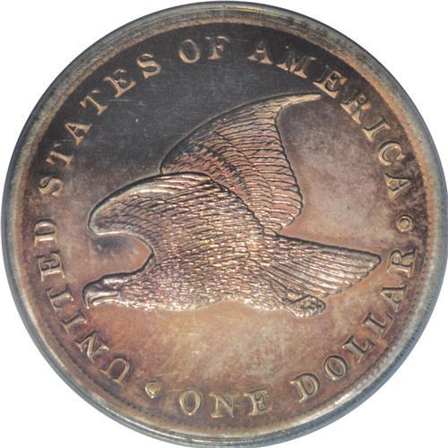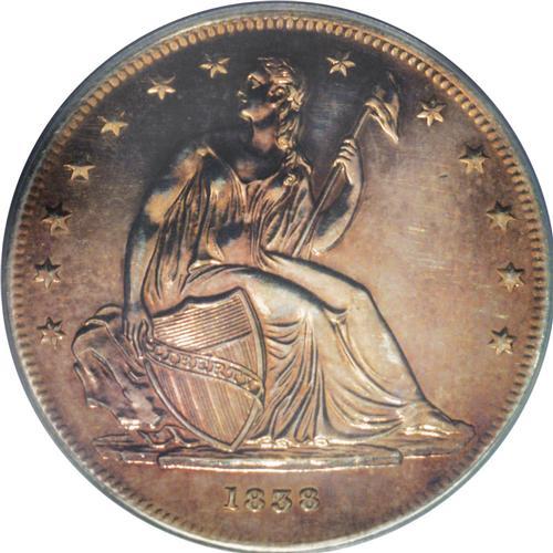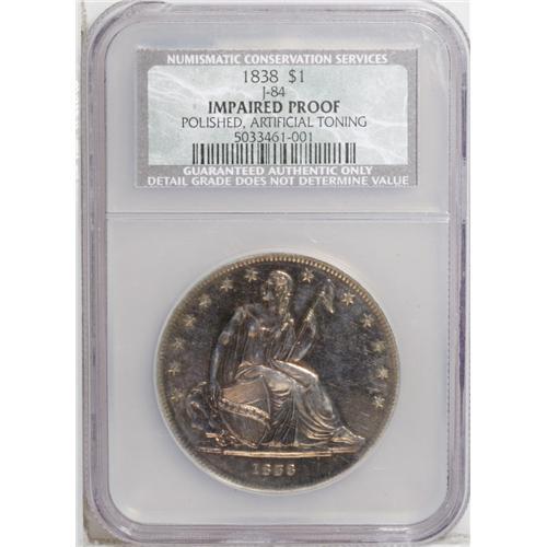 <B>1838<PS$1> Name Omitted, Judd-84 Original, Pollock-93, R.5--Polished, Artificial Toning--NCS. Impaired Proof.</B></I> Silver. Reeded edge. Die Alignment III (head of Liberty opposite the N in ONE). This coin appears to be an original; that is, a piece that was produced during the first striking period in the late 1850s. No coins are known in Die Alignment I and even the Smithsonian's example is in Die Alignment IV. There are no die cracks on the reverse of this piece. That and the alignment indicate it was struck in the late 1850s, as later restrikes all show microscopic die cracks on the reverse. This coin shows noticeable softness of highpoint details, most evident on Liberty's foot and peripheral stars. Close examination with a magnifier also shows a lack of crispness between the lettering and fields on the reverse. This seems somewhat curious since these coins were allegedly struck as "trade bait" by James Ross Snowden. The surfaces are extensively hairlined from cleaning, and the coin displays light golden-rose coloration. An interesting coin for the specialist.