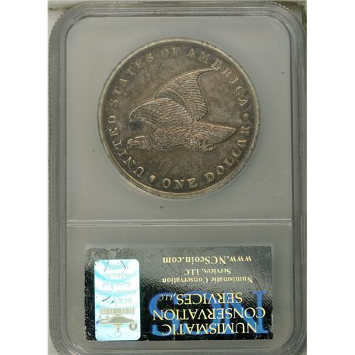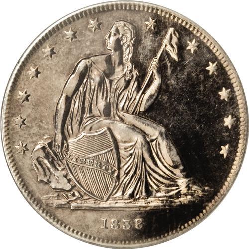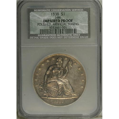 <B>1838 PS$1 Name Omitted, Judd-84 Restrike, Pollock-93, R.5--Polished, Artificial Toning--NCS. Impaired Proof.</B></I> Silver. Reeded Edge. Die Alignment III (head of Liberty opposite the N in ONE). This coin appears to have been produced during the first striking period in the late 1850s. No coins are known in Die Alignment I, and even the Smithsonian's example is in Die Alignment IV. There are no die cracks on the reverse of this piece. That and the alignment indicate it was struck in the late 1850s, as later restrikes all show microscopic die cracks on the reverse. This coin shows noticeable softness of highpoint details, most evident on Liberty's foot and peripheral stars. Close examination with a magnifier also shows a lack of crispness between the lettering and fields on the reverse. This seems somewhat curious since these coins were allegedly struck as "trade bait" by James Ross Snowden. The surfaces are extensively hairlined from cleaning, and the coin displays light golden-rose coloration. An interesting coin for the specialist.<BR><BR><b>Shipping:</b> Coins & Currency (<a target="_blank" href="http://www.heritageauctions.com/common/shipping.php">view shipping information</a>)