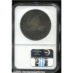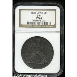 <B>1838<PS$1> Name Omitted, Judd-84 Restrike, Pollock-93, R.5, PR65 NGC.</B></I> Die Alignment III. Reeded Edge. Silver. Like the Judd-58 above, all 1838 dollars are considered patterns. Unlike the circulation issues of 1836 (Judd-60) and 1839 (Judd-104), no 1838 dollars were intentionally made for public distribution. The 1838 dollars were made to test two new design features: (1) a reeded edge, and (2) the removal of the 26 stars from the reverse of the 1836 dollar and the placing of 13 new stars around the obverse. It is clear that the <I>dies</B></I> for the 1838 dollar were made in 1838; however, it is not certain how many (if any) 1838 dollars were actually struck in 1838. Only one original specimen is known, and that coin is a part of the U.S. Mint Collection now retained by the Smithsonian. However, the Smithsonian specimen exists in Die Alignment IV orientation (not Alignment I, as asserted by Breen), and was struck from an uncracked reverse die. All 1838 dollars that have been observed in private collections or museum holdings appear to be restrikes made in the late 1850s under the authority of Director James Ross Snowden, or in the late 1860s by Director Henry R. Linderman. Like the present specimen, the restrikes were made to satisfy collector demand for these beautiful coins. The restrikes are generally found in Die Alignment III orientation (i.e., head of Liberty opposite the NE of ONE) as on this coin; however, a few restrikes were also made in Die Alignment IV. Although the exact mintage of 1838 dollars is unknown, recent estimates suggest that fewer than 250 coins were ultimately made, and that only a small fraction of these coins survive today. The restrikes can be distinguished from the originals by the presence of a faint die crack through portions of MERI, which is faintly seen on this coin.<BR> The present coin also exhibits deeply mirrored surfaces and is pleasingly toned with deep cobalt and gray-purple toning--evenly balanced from one side to the other. Only a small number of hairlines are evident on either side, and are consistent with the Proof 65 grade. A small area of planchet roughness is noted next to the denticles between 7 and 8 o'clock on the obverse, which easily serves as a pedigree identifier for future researchers.<BR> A total of fifty-two 1838 dollars have been certified by PCGS (30) and NGC (22), with only seven coins at the Proof 65 level, and none higher. The present specimen is certainly among the finest known 1838 dollars. <BR><BR><B>Important notice:</B> Heritage usually auctions material at the rate of 200-250 lots per hour. On some occasions eBay Live bid software or the Internet may not be able to keep up with the pace of the auction. We recommend placing a realistic absentee bid now as insurance to avoid disappointment. Occasionally the auctioneer may eliminate or reject an eBay Live bid, and the auctioneer may also reopen a lot after the close of the eBay live bidding (usually because we missed an audience bid), and may reject your bid even if it shows you as the winning bidder. By bidding via eBay Live, you agree that Heritage may award the lot to another bidder at its sole discretion under the circumstances described above or any other reasonable circumstances. Since eBay bids are not shown to us until we open the lot on the floor, we treat those bids just like floor bids. In most cases the floor responds before the eBay bid is presented to us, due to Internet lag time, so for consistency we have made it a policy that floor bids are always considered first over tie eBay live bids. Also please note that all Heritage lots purchased through eBay Live carry a 20% Buyer's Premium. Please make sure you read the Terms and Conditions before you bid.