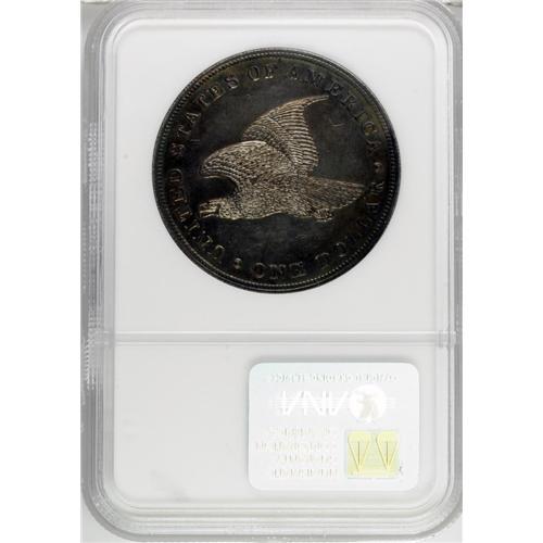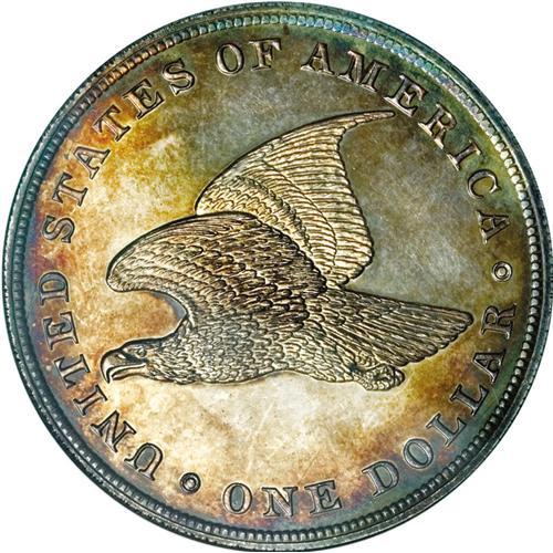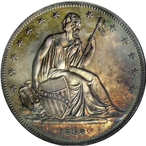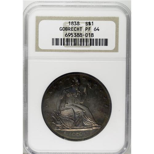 <B>1838 PS$1 Name Omitted, Judd-84 Restrike, Pollock-93, R.5, PR64 NGC.</B></I> Silver. Reeded edge. Die Alignment III (center of Liberty's head opposite N in ONE). Another Die Alignment III 1838 dollar, and an unusual, high grade offering of this rarity. The die cracks through MERI in AMERICA and at the base of LAR in DOLLAR are extremely faint, indicating this was probably one of the first restrikes coined in the 1860s under Henry Linderman's first term as mint director. If one accepts that die cracks become more pronounced over time (a logical conclusion), and that only one pair of dies was used, then one comes to a curious conclusion regarding 1838 dollars. That is, the Die Alignment IV coins were most likely struck <I>before</B></I> the Die Alignment III coins, as they sometimes lack the reverse die cracks and such coins may represent original strikings from 1839.<BR> Only 250-300 restrike 1838 dollars are believed to have been produced on an irregular basis (according to who was mint director at the time) over a 20-year period from the late 1850s through the late 1870s. Dollars dated 1838 are definitely the rarest of the three dates of the Gobrecht design. There are certainly very few examples in this superlative condition. NGC and PCGS combined have only certified seven other pieces in PR64, and only two Gems have been graded (both by NGC). This is a magnificent coin that has deeply mirrored fields. The striking details are especially crisp with complete definition on Liberty's head, the peripheral stars, reverse lettering, and the eagle's plumage. The surfaces display warm golden-rose coloration that is irregularly spread over each side with occasional deep blue toning around the margins. There are no obvious marks on either side of this immensely attractive near-Gem. An important opportunity to acquire this key to the Gobrecht series in one of the finest grades obtainable.<BR><BR><b>Shipping:</b> Coin/Currency (<a target="_blank" href="http://www.heritageauctions.com/common/shipping.php">view shipping information</a>)